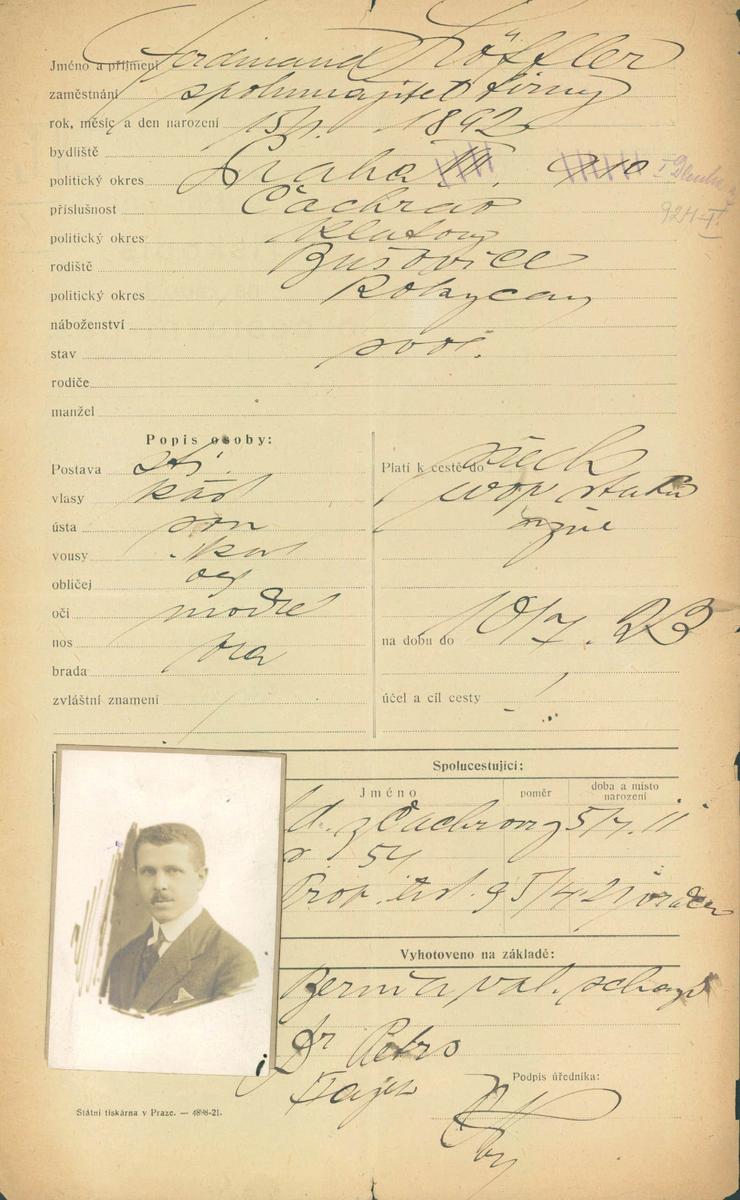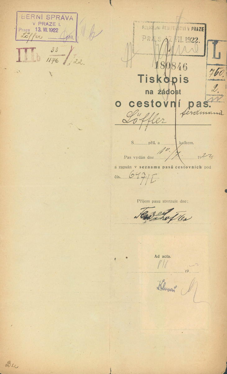 Leffler Ferdinand: Žádost o vydání cestovního pasu