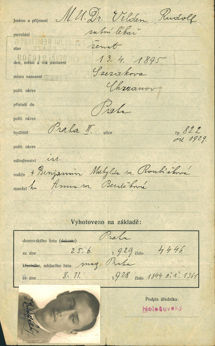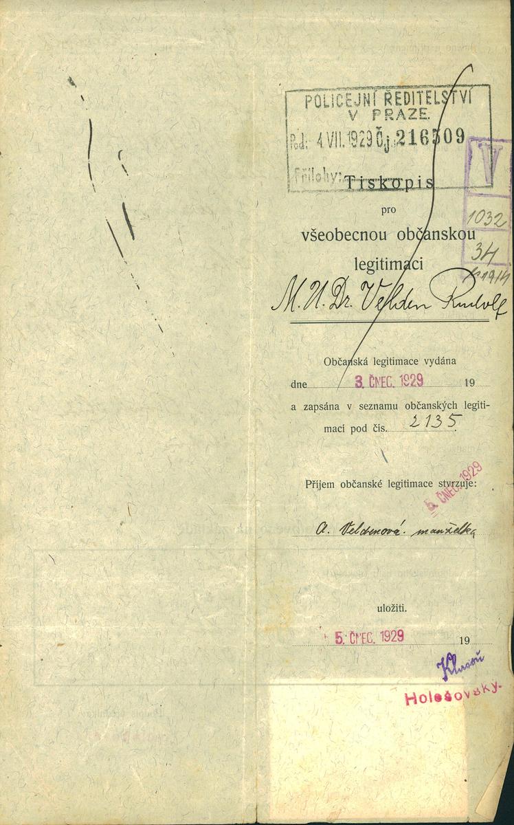 Velden Rudolf: Žádost o vydání občanské legitimace