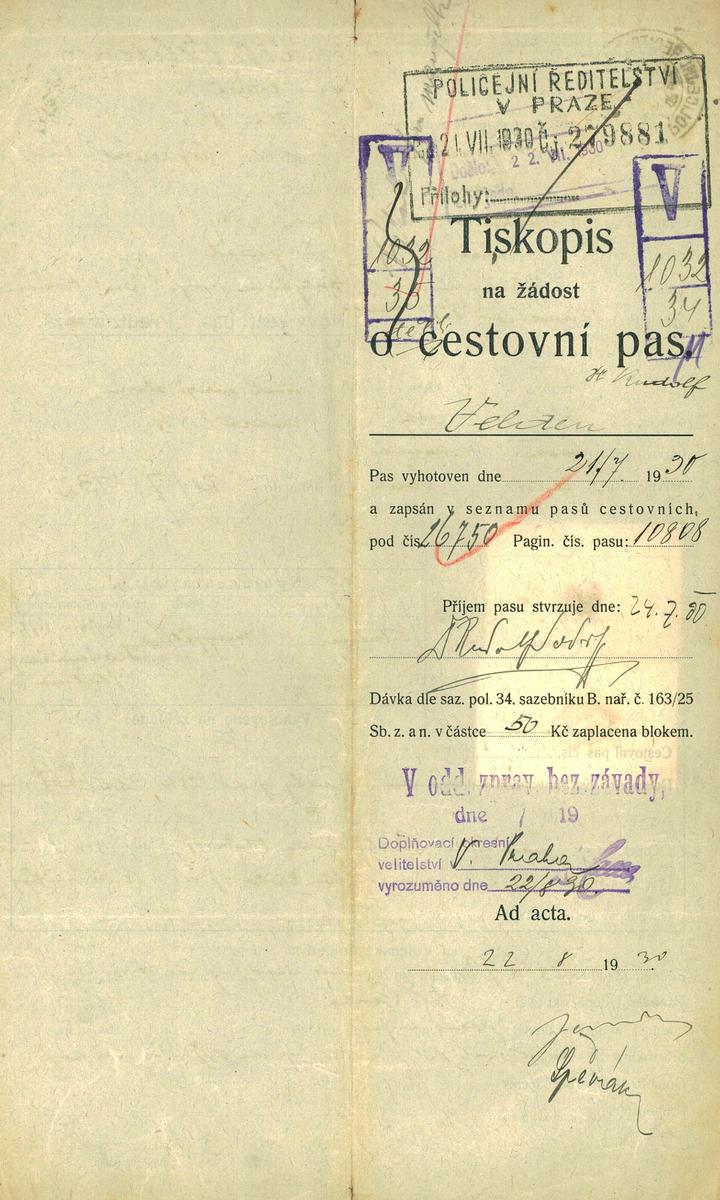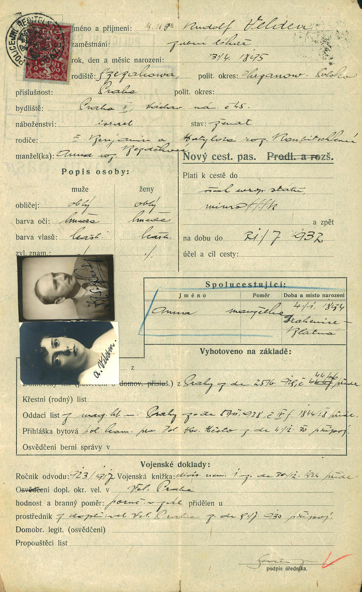 Velden Rudolf: Žádost o vydání cestovního pasu
