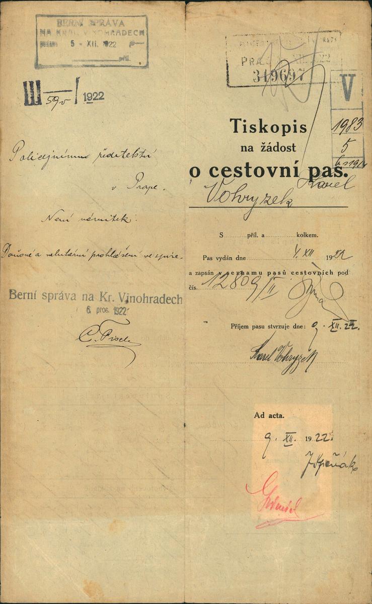 Vohryzek Karel: Žádost o vydání cestovního pasu