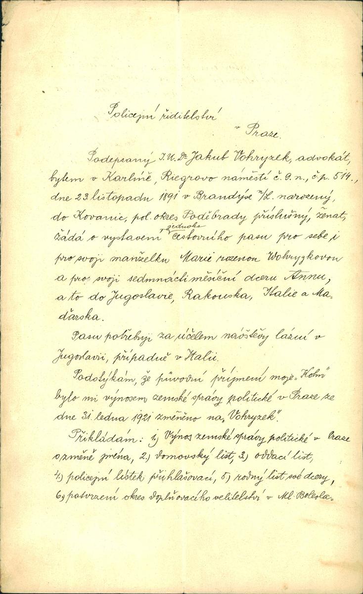 Vohryzek Jakob: Žádost o vydání cestovního pasu