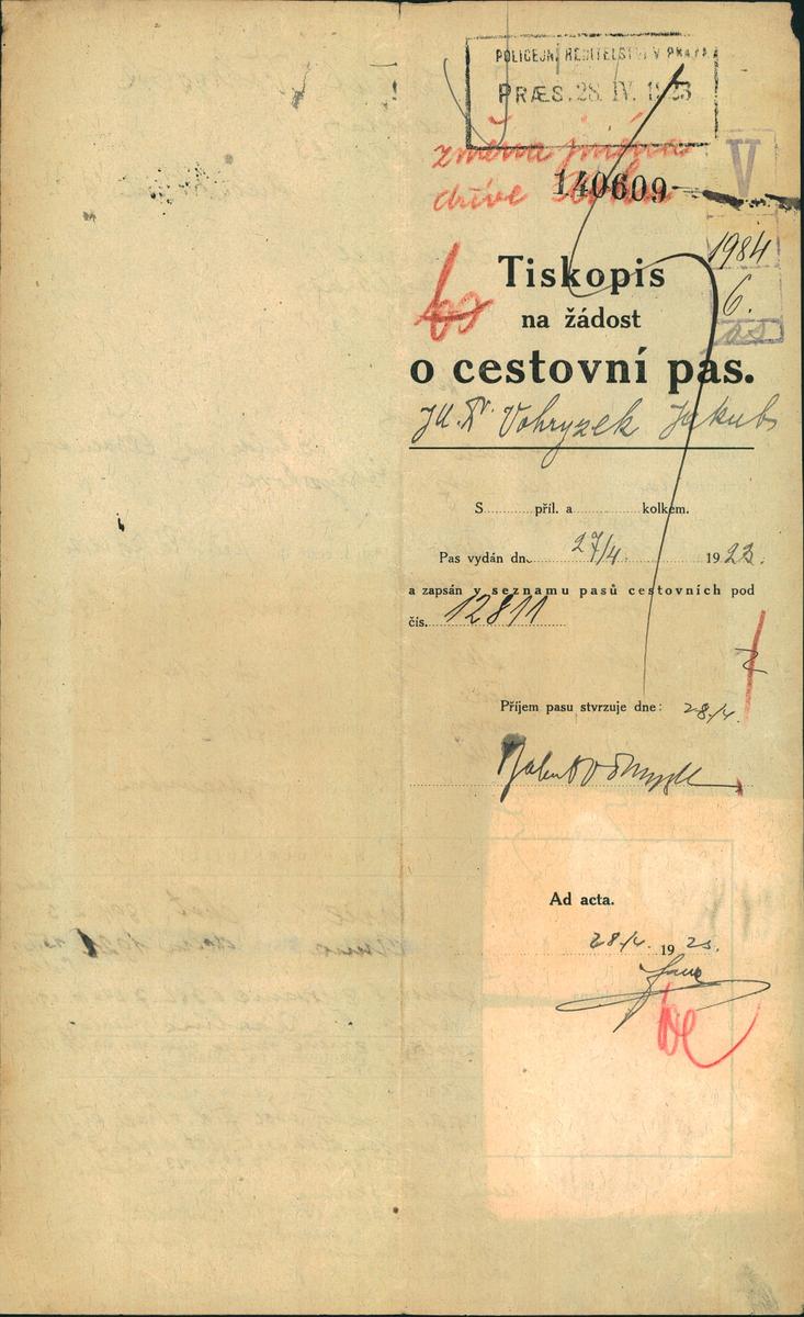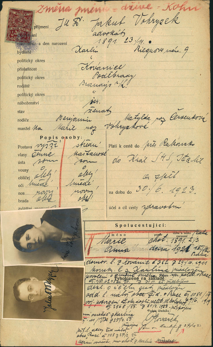 Vohryzek Jakob: Žádost o vydání cestovního pasu