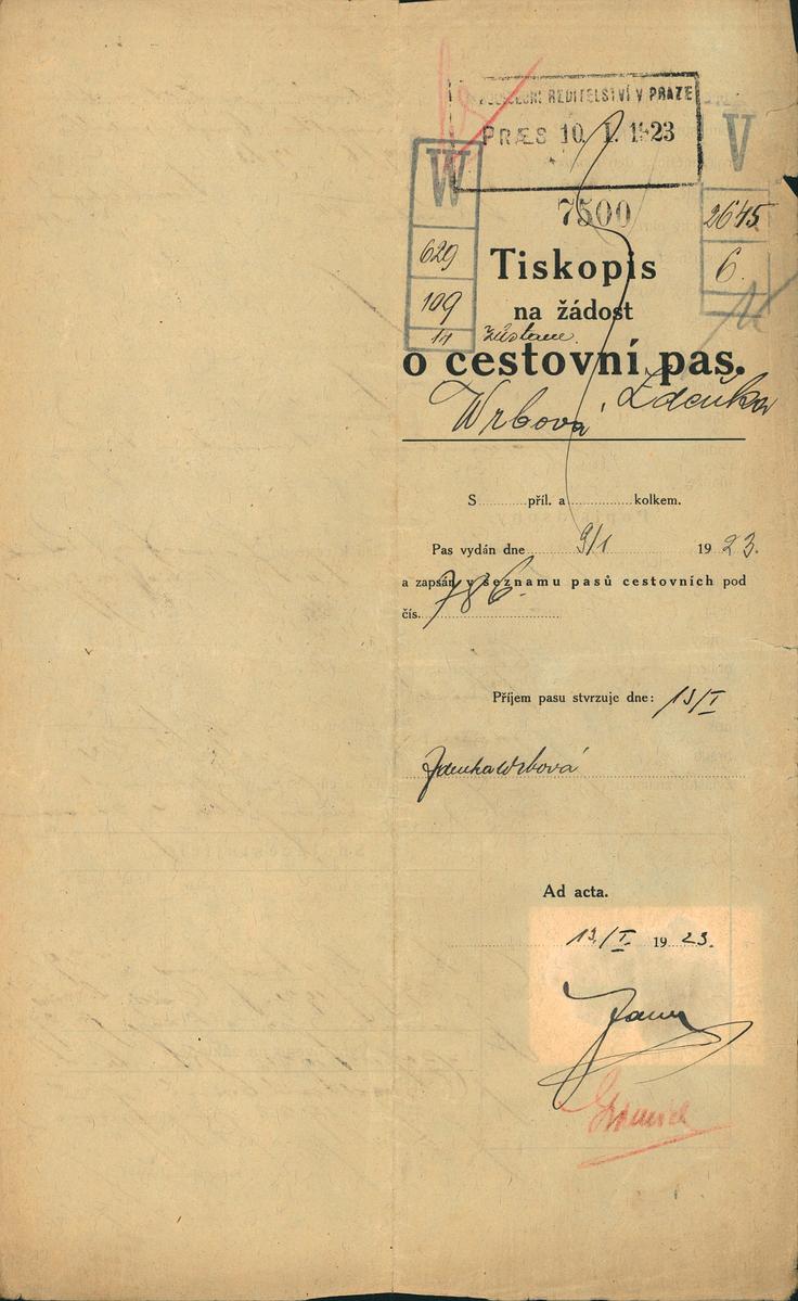Vrbová Zdenka: Žádost o vydání cestovního pasu