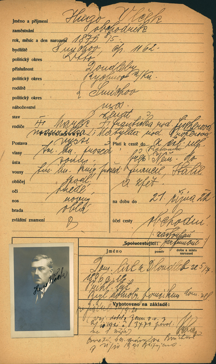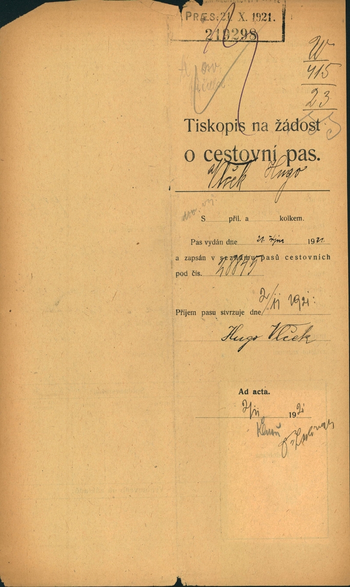 Vlček Hugo: Žádost o vydání cestovního pasu