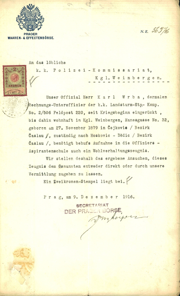 Vrba Karel: Žádost o vystavení vysvědčení zachovalosti