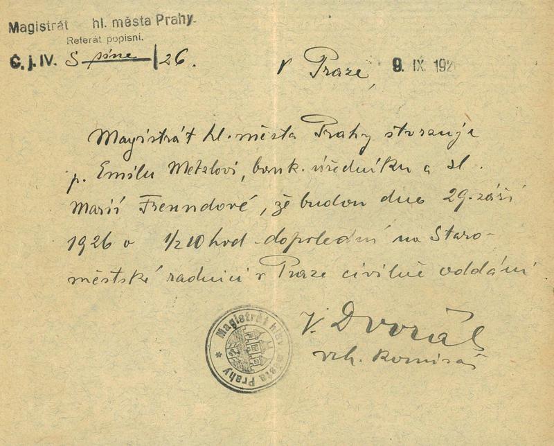 Metzlová Marie Hermína: Potvrzení o chystaném sňatku