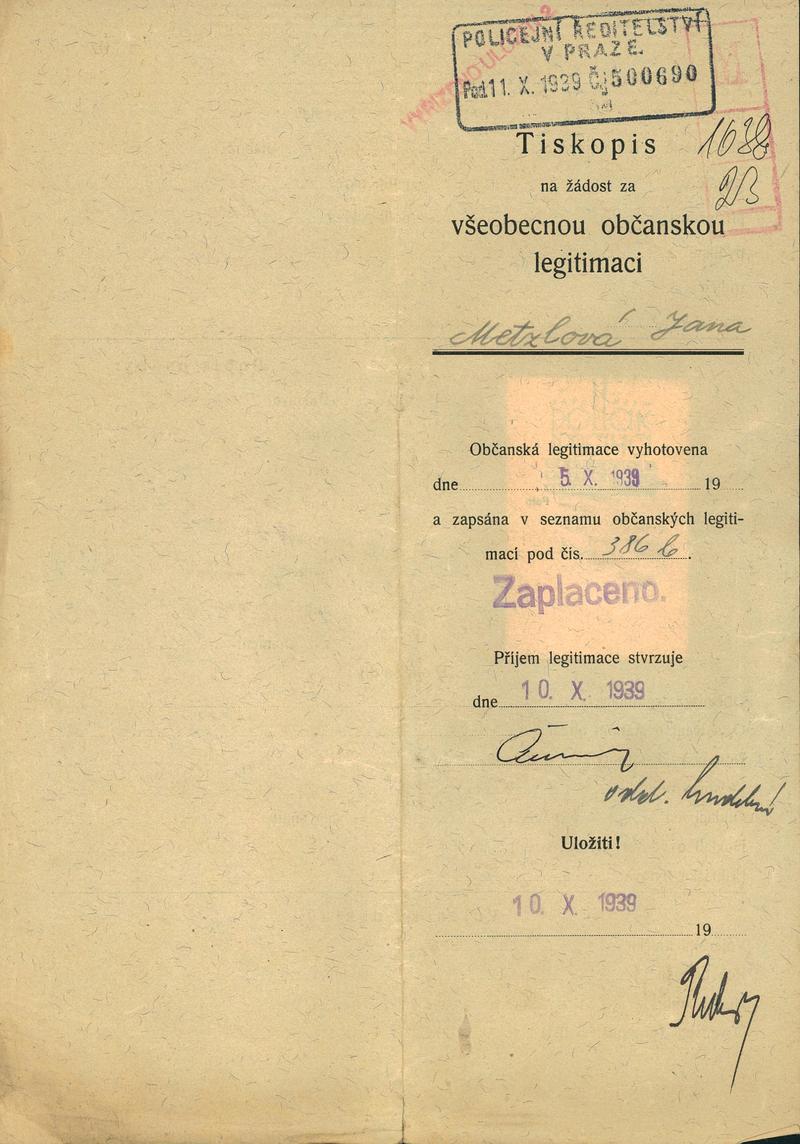Metzlová Jana: Žádost o vydání občanské legitimace