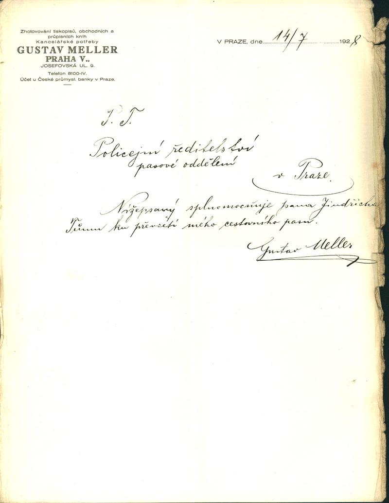 Meller Gustav: Plná moc k vyzvednutí cestovního pasu