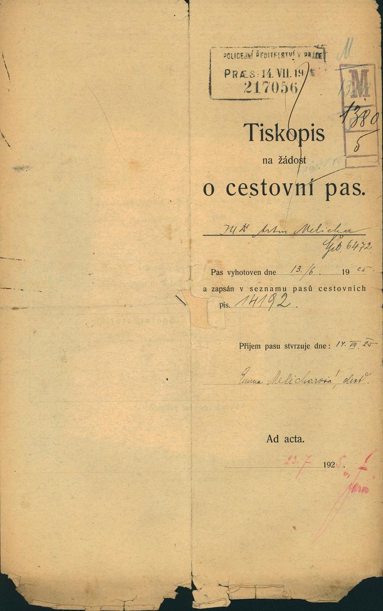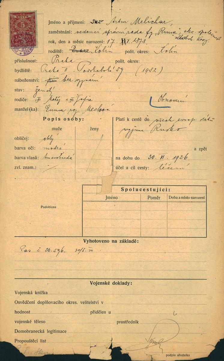 Melichar Artur: Žádost o obnovení cestovního pasu