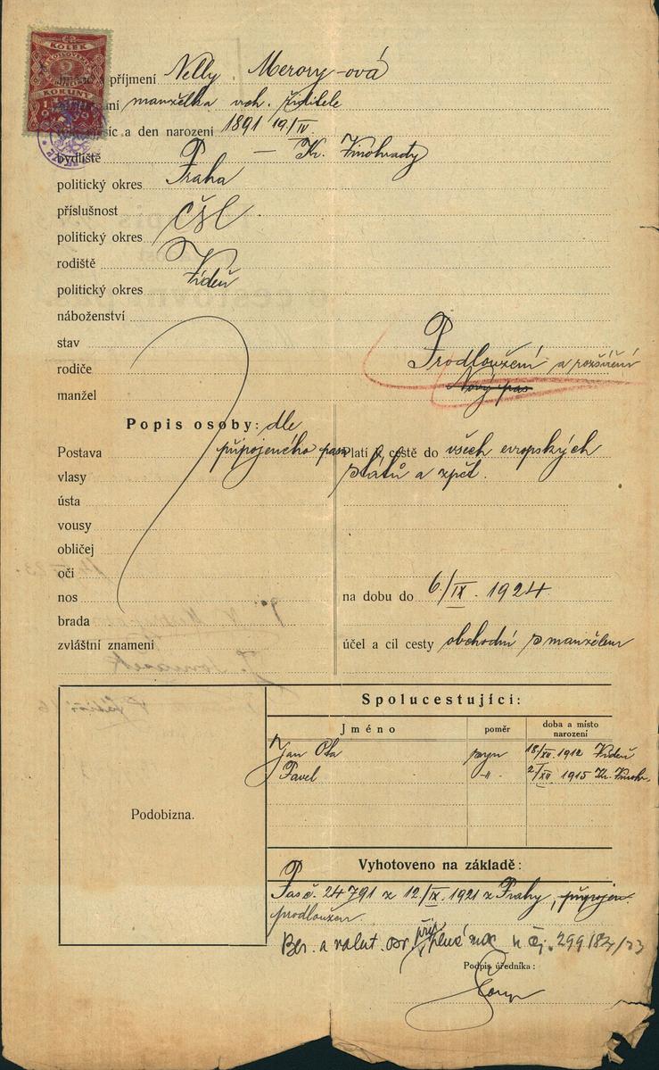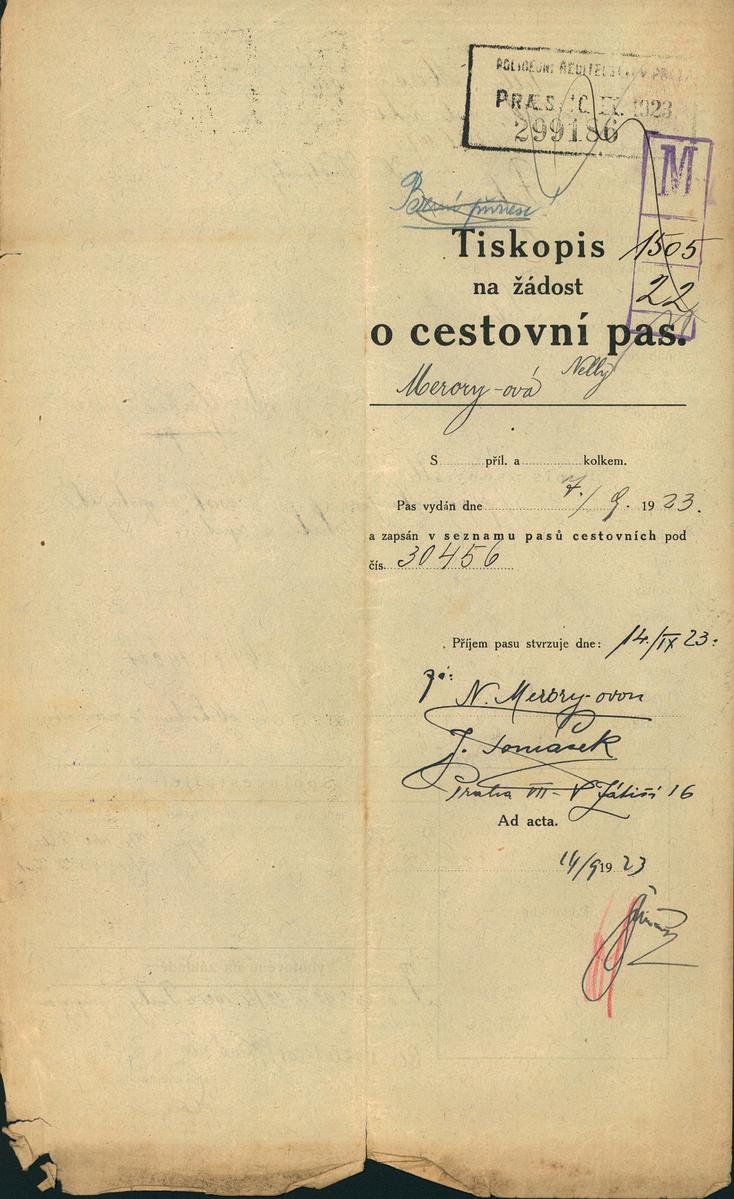 Meroryová Nely: Žádost o prodloužení a rozšíření cestovního pasu