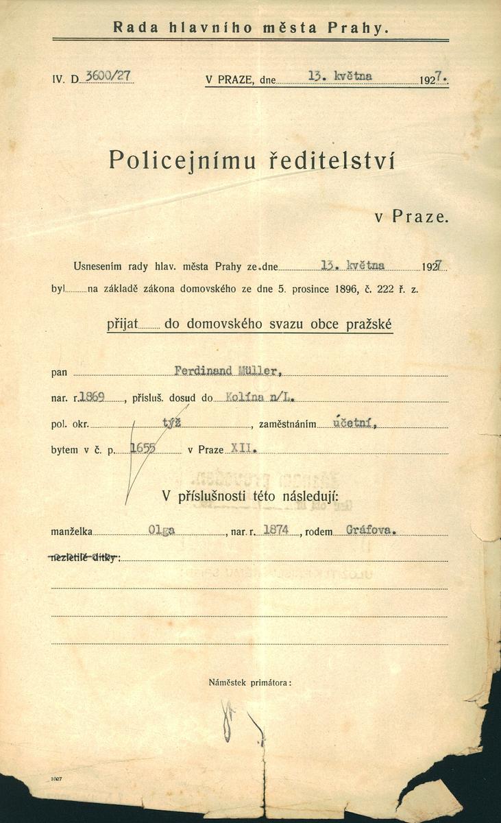 Müller Ferdinand: Nabytí domovského práva