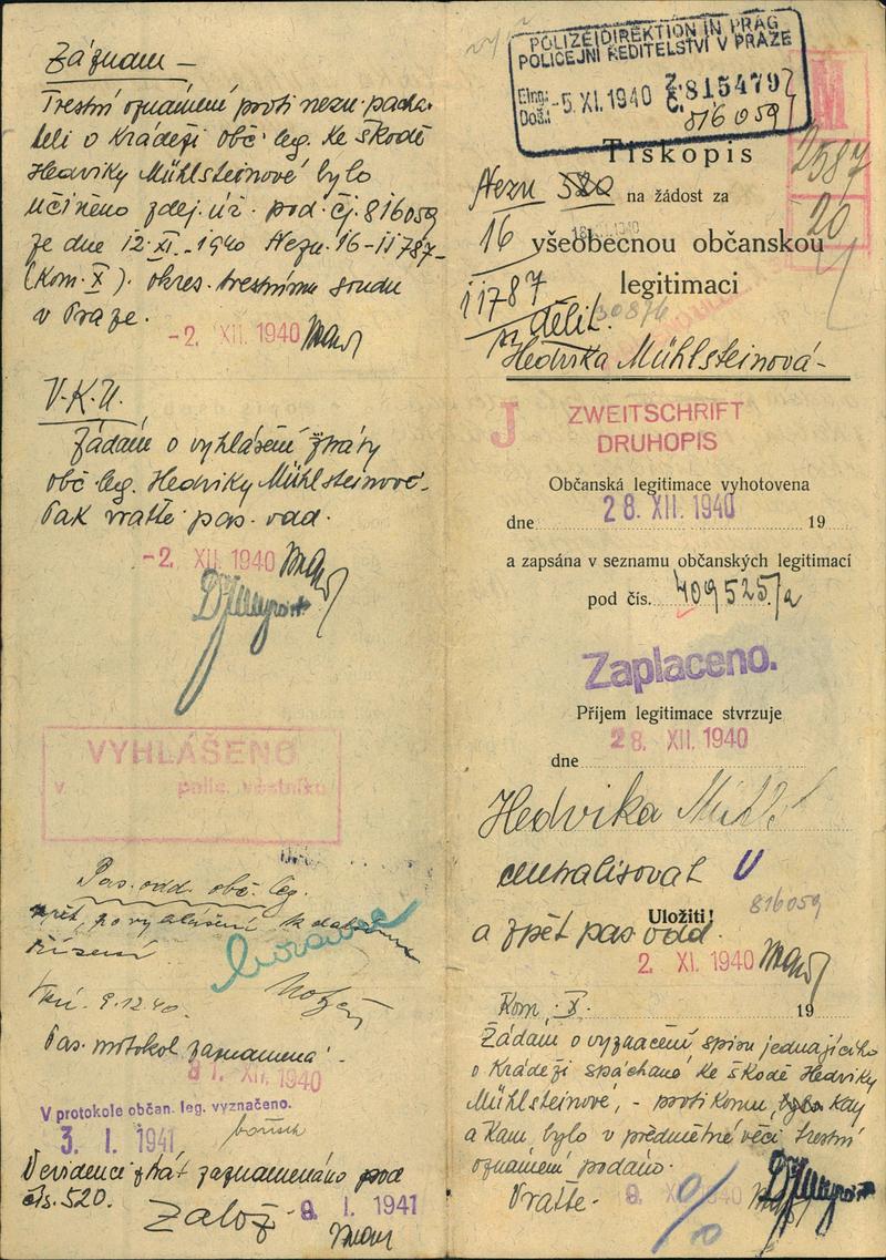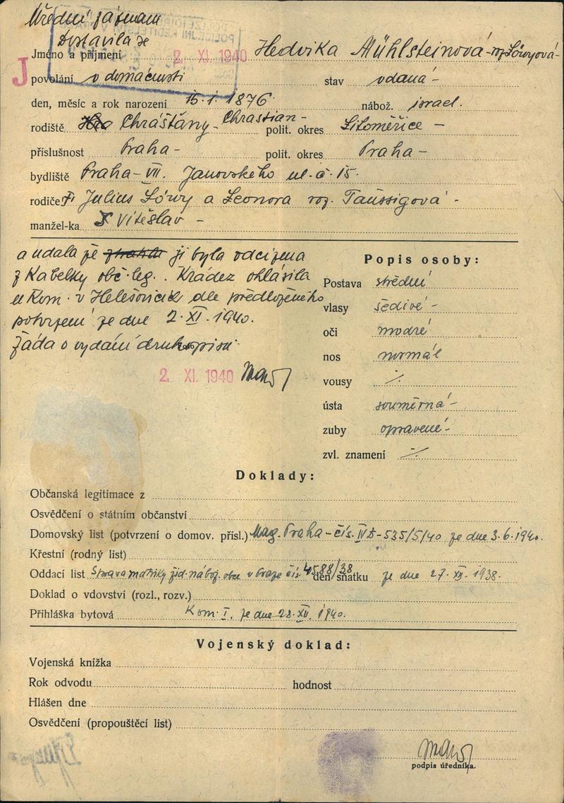 Mühlsteinová Hedvika: Žádost o vydání druhopisu občanské legitimace