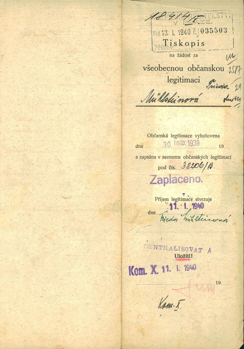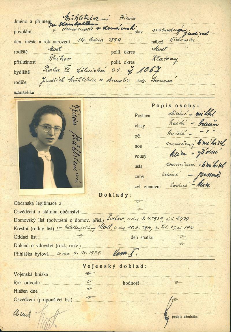 Mühlsteinová Frieda: Žádost o vydání občanské legitimace