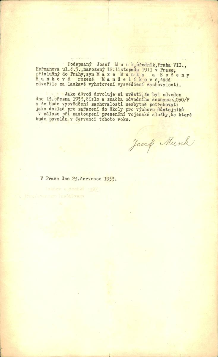 Munk Josef: Žádost o vystavení vysvědčení zachovalosti