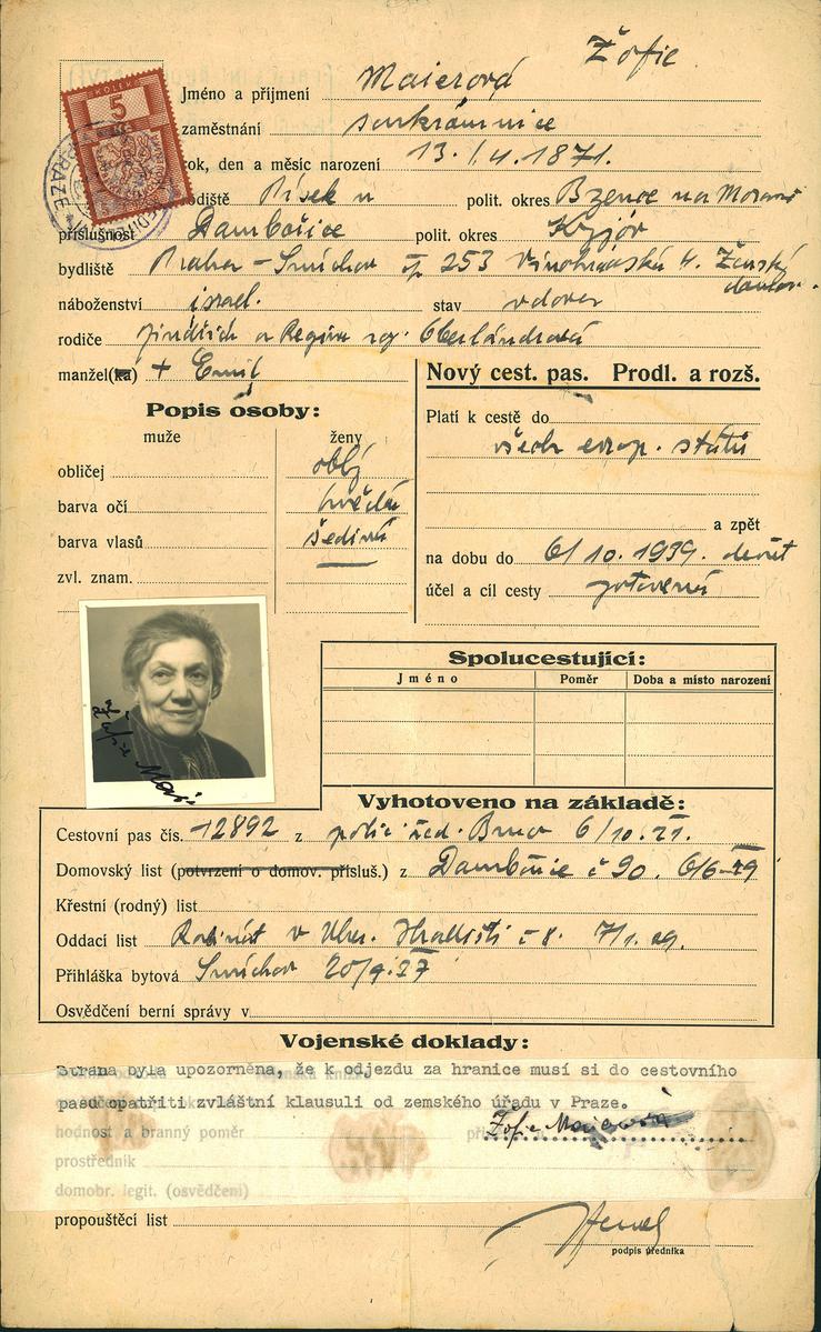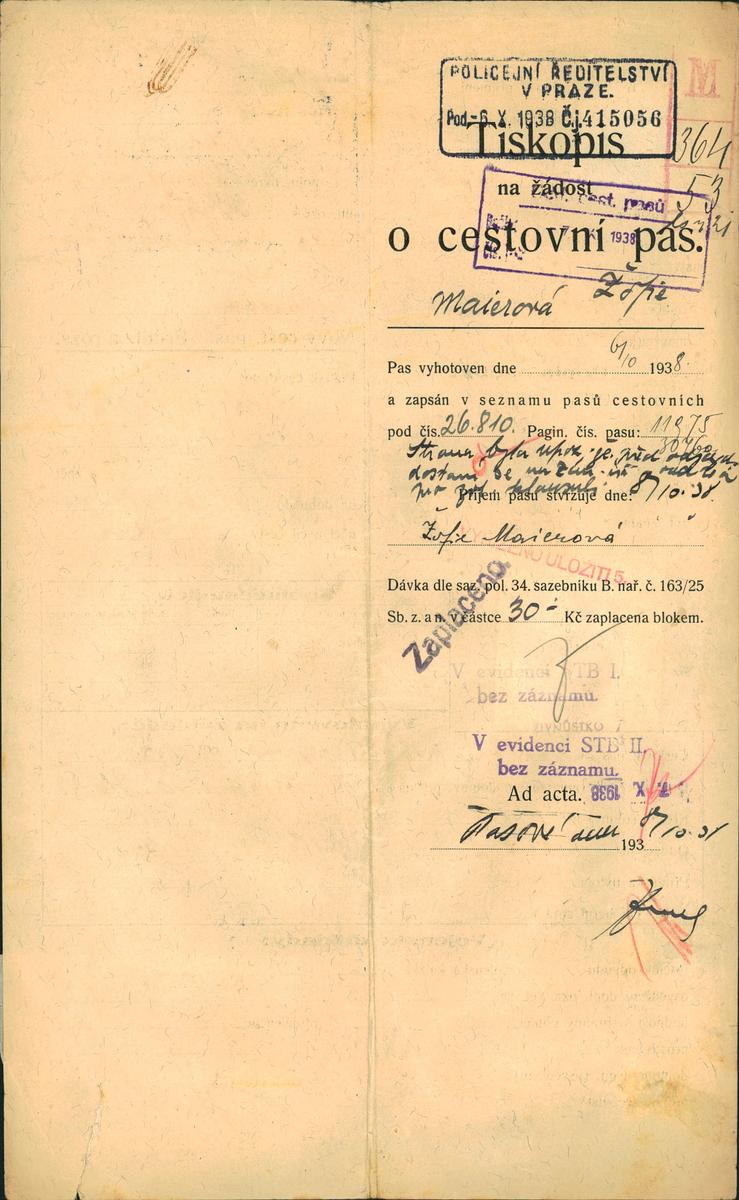Maierová Žofie: Žádost o vydání cestovního pasu