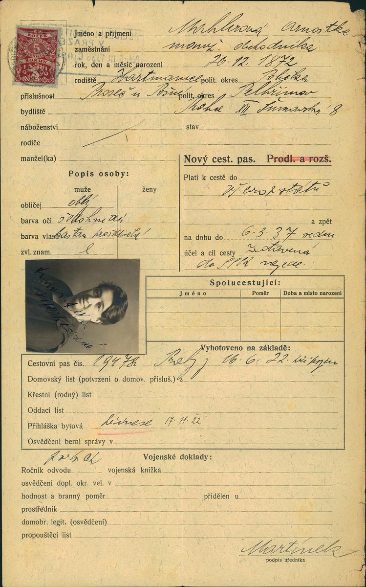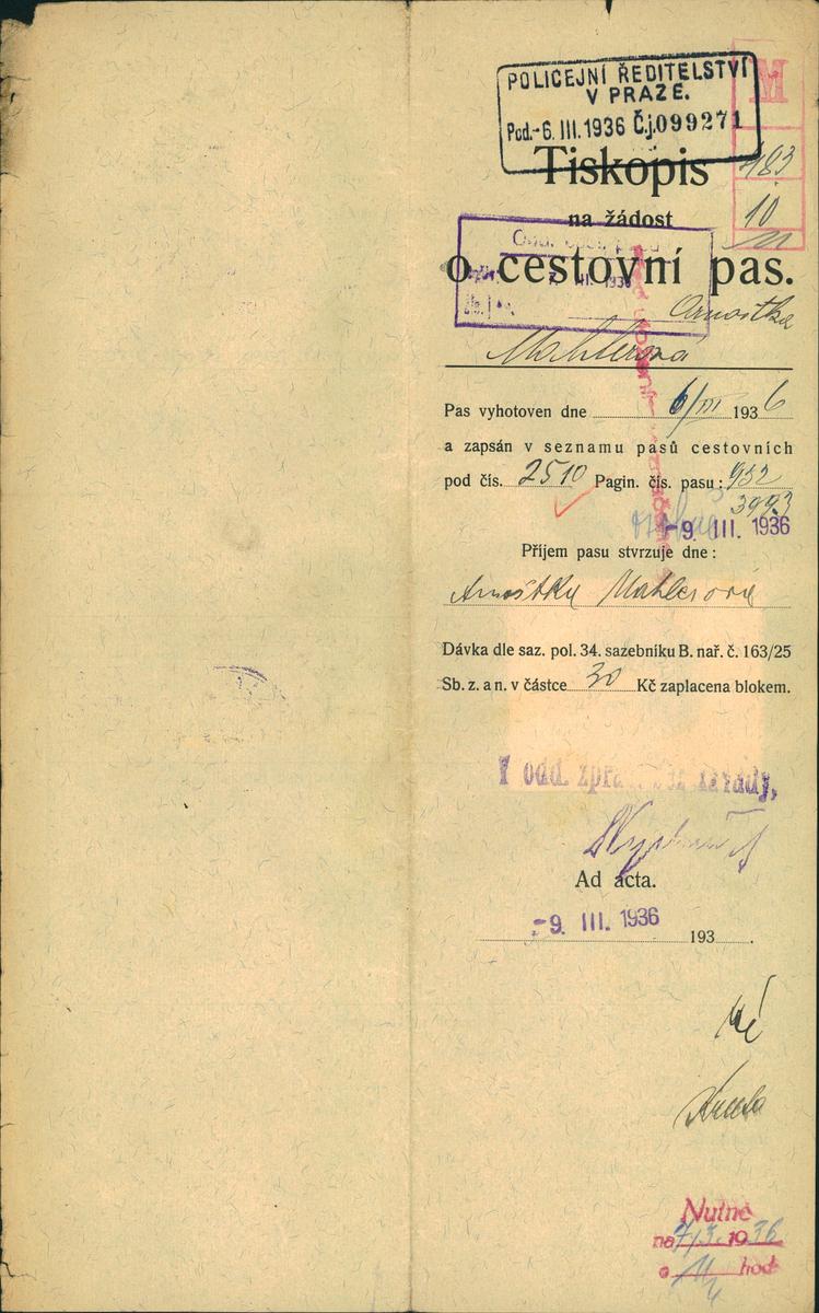 Mahlerová Arnoštka: Žádost o vydání cestovního pasu