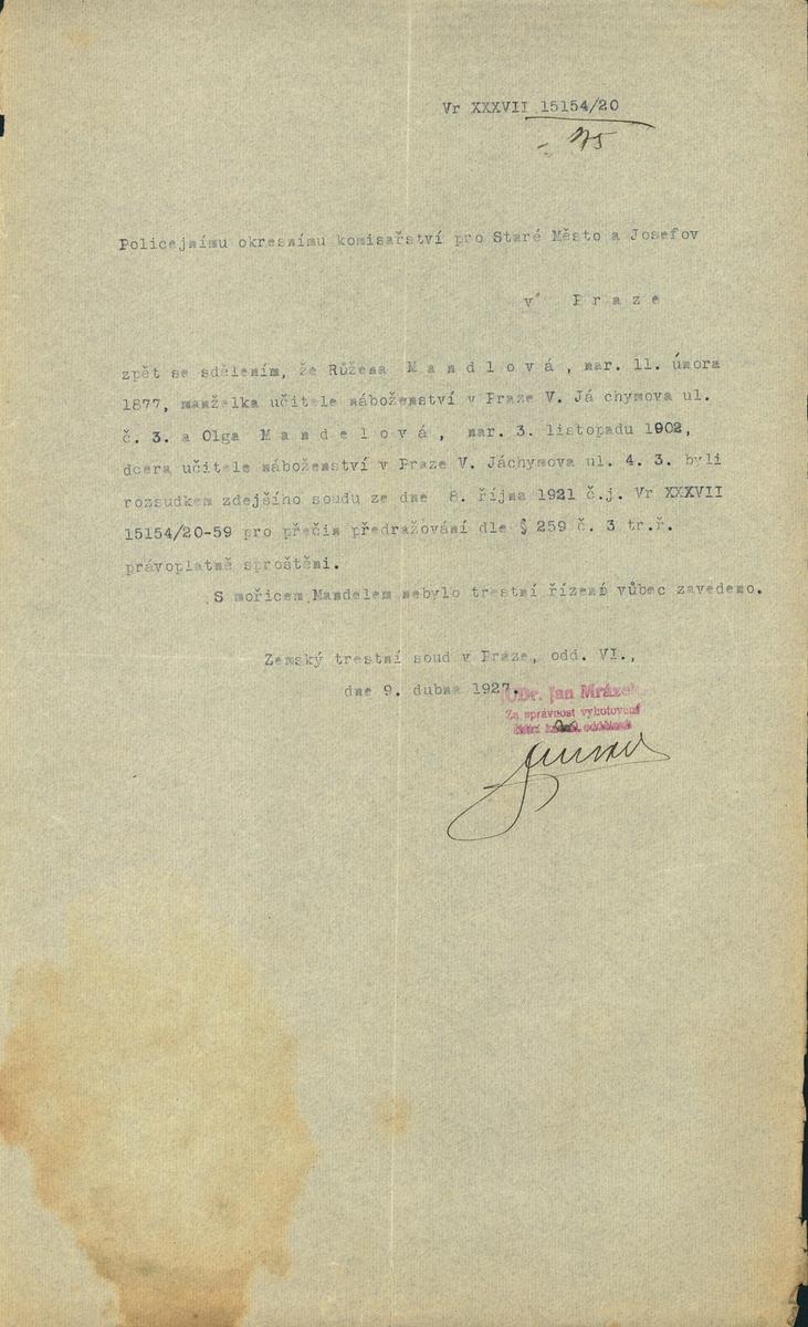 Mandl Mořic: Zpráva o výsledku trestního řízení