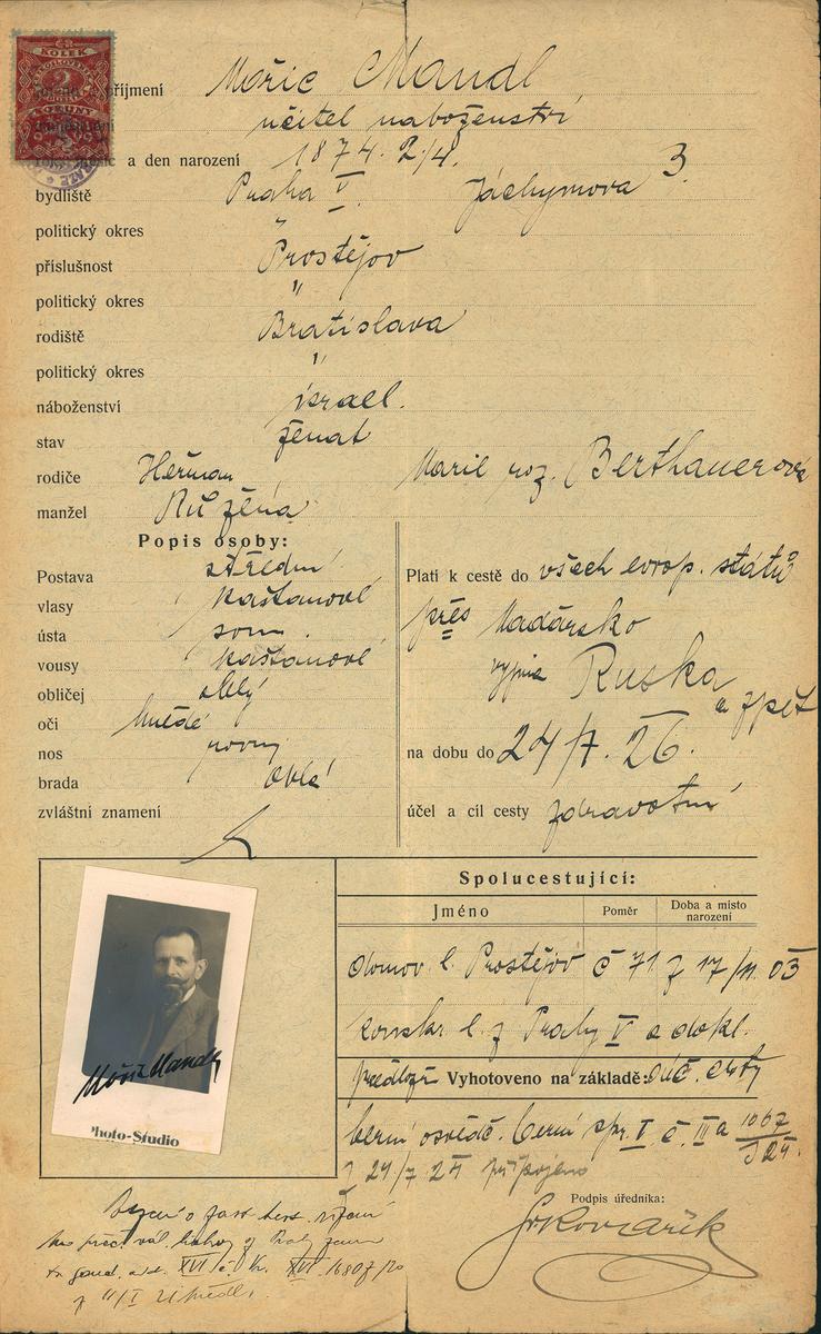 Mandl Mořic: Žádost o vydání cestovního pasu