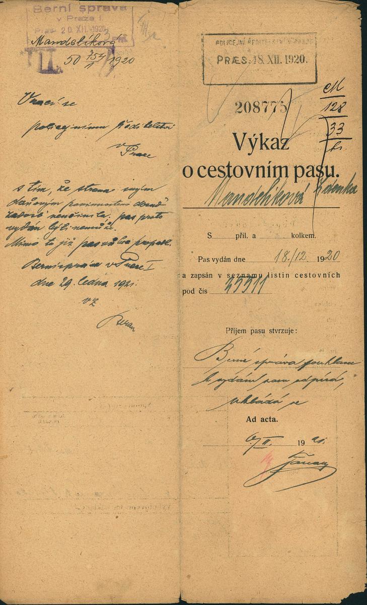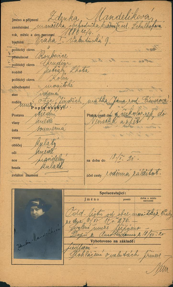 Mandeliková Zdeňka: Žádost o vydání cestovního pasu