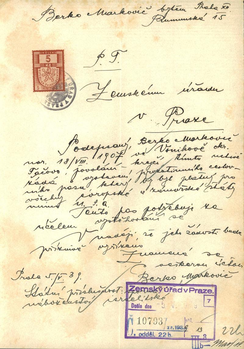 Markovics Berko: Žádost o vydání prozatímního cestovního pasu