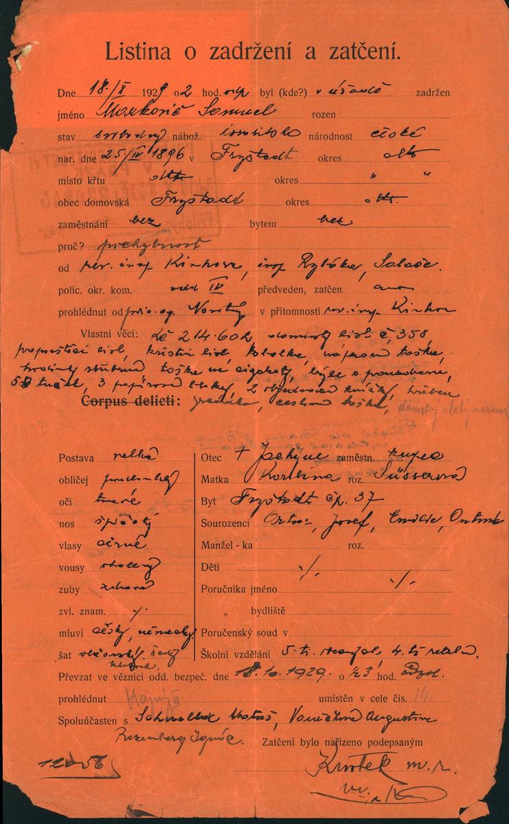 Markowicz Samuel: Protokol o zadržení a zatčení