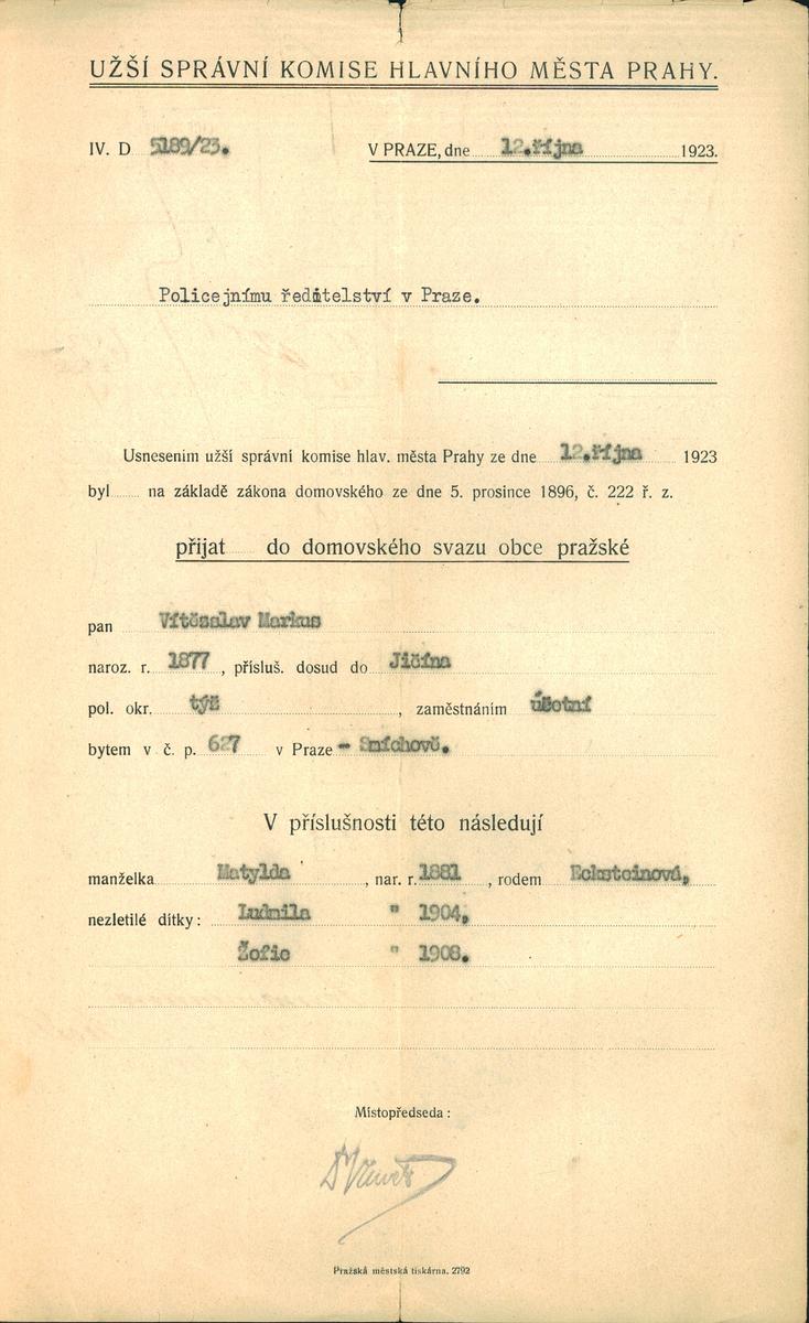 Markus Vítězslav: Nabytí domovského práva