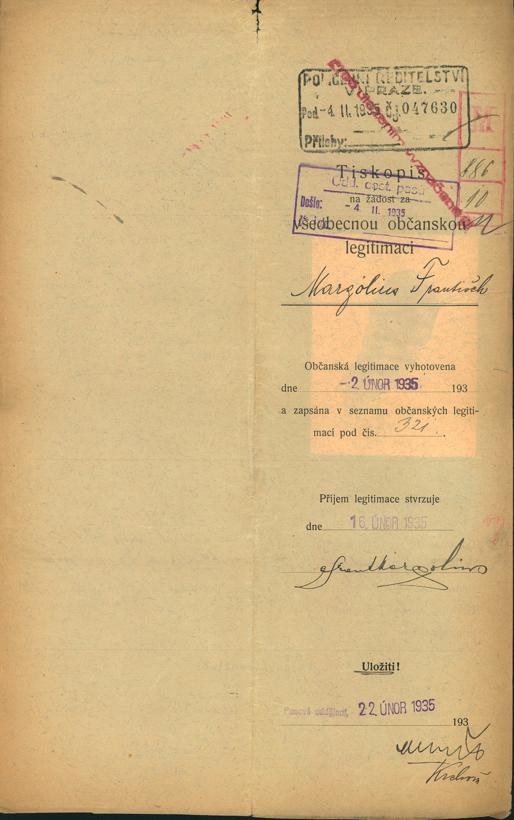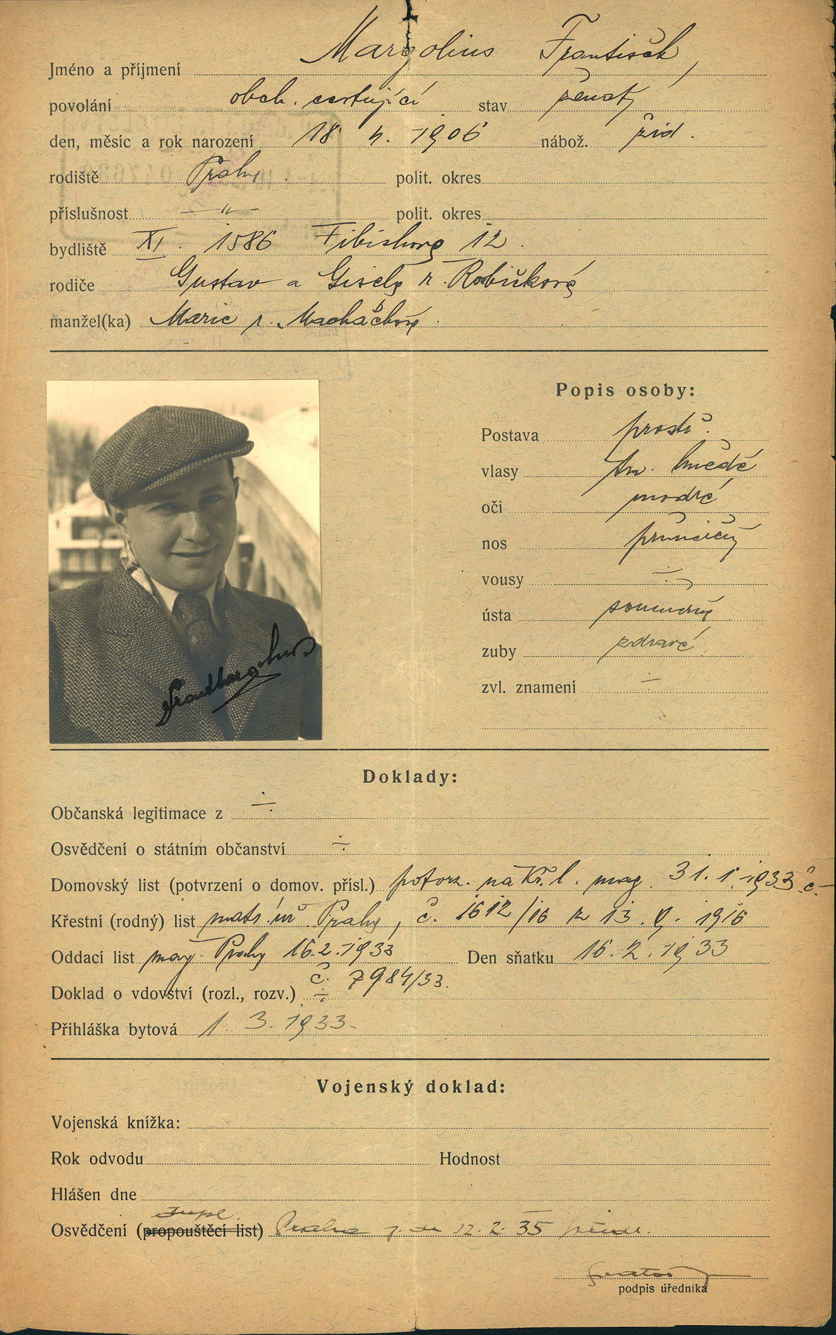 Margolius František: Žádost o vydání cestovního pasu