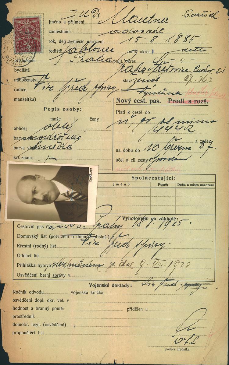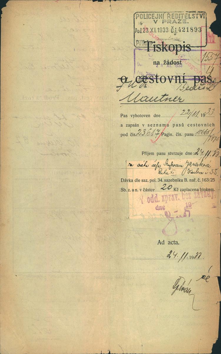 Mautner Bedřich: Žádost o vydání cestovního pasu
