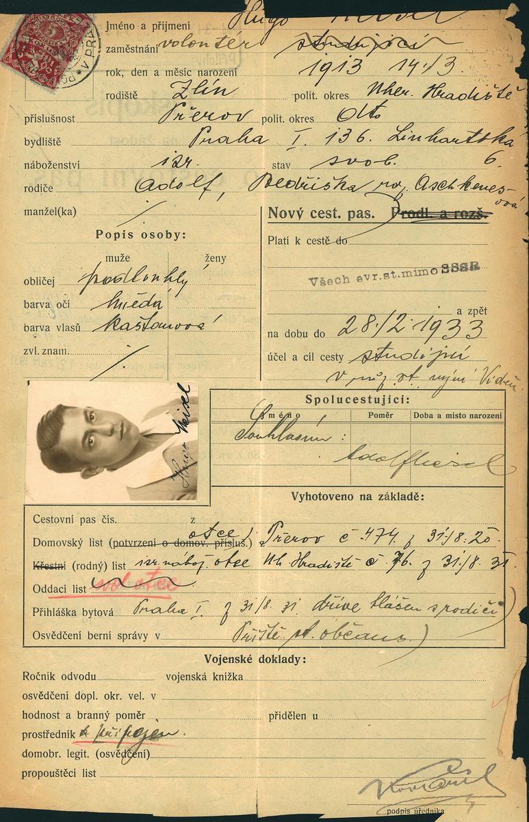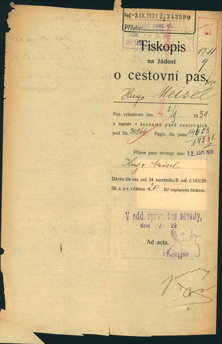 Meisel Hugo: Žádost o vydání cestovního pasu