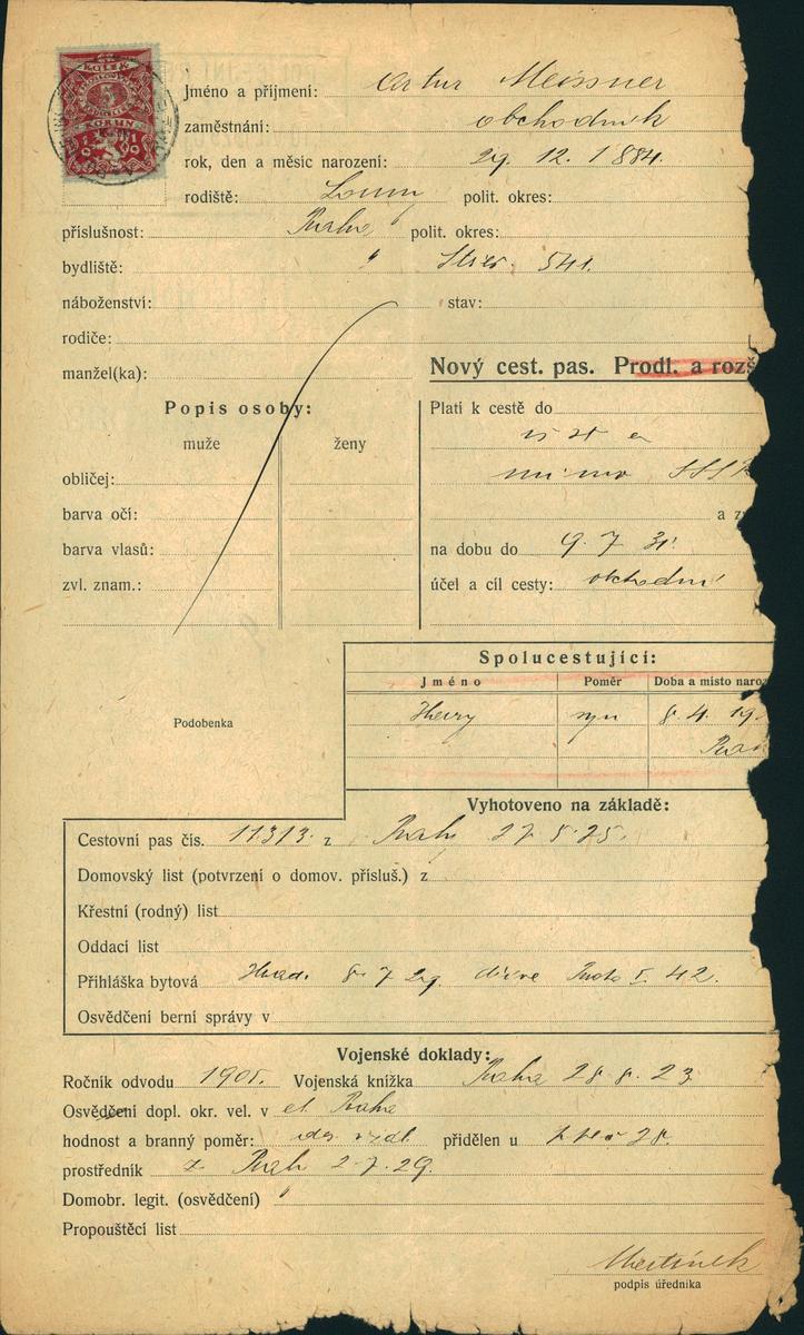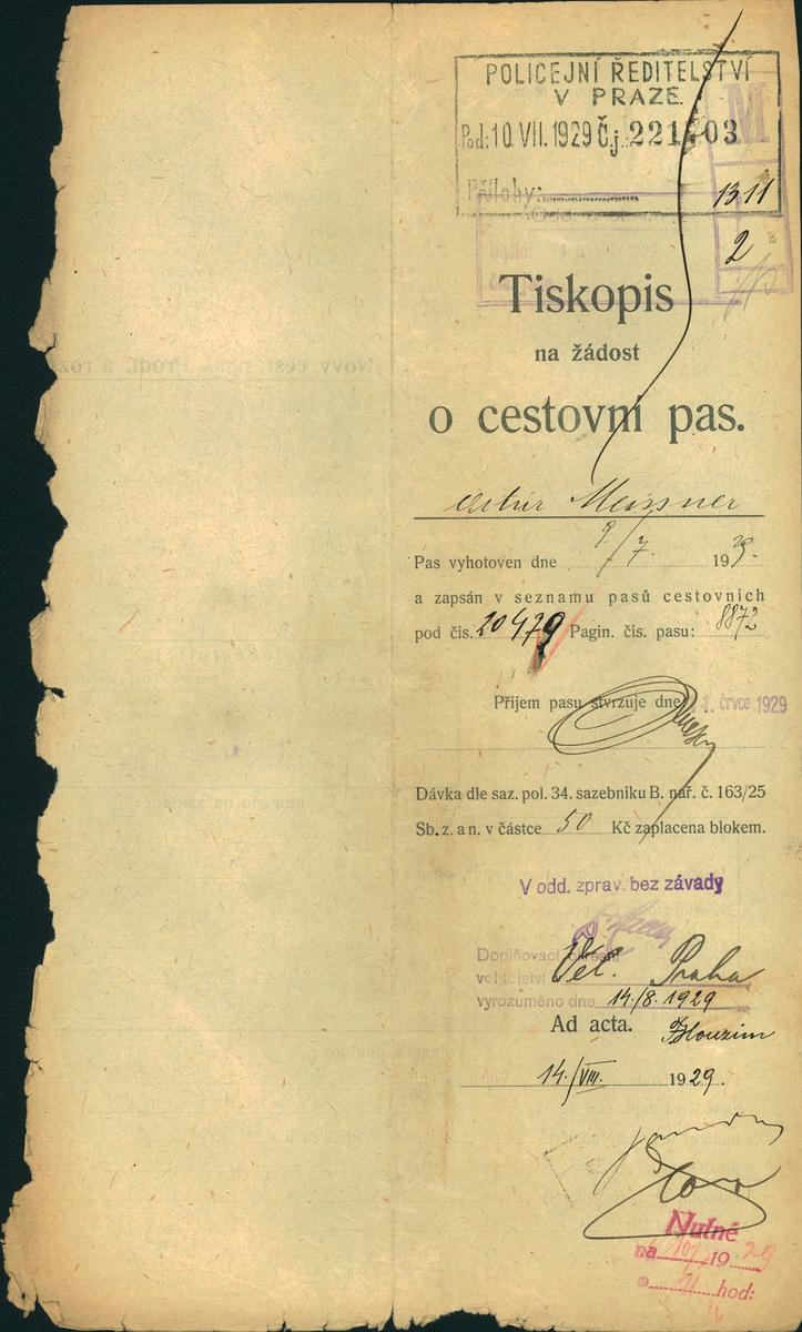 Meissner Artur: Žádost o vydání cestovního pasu