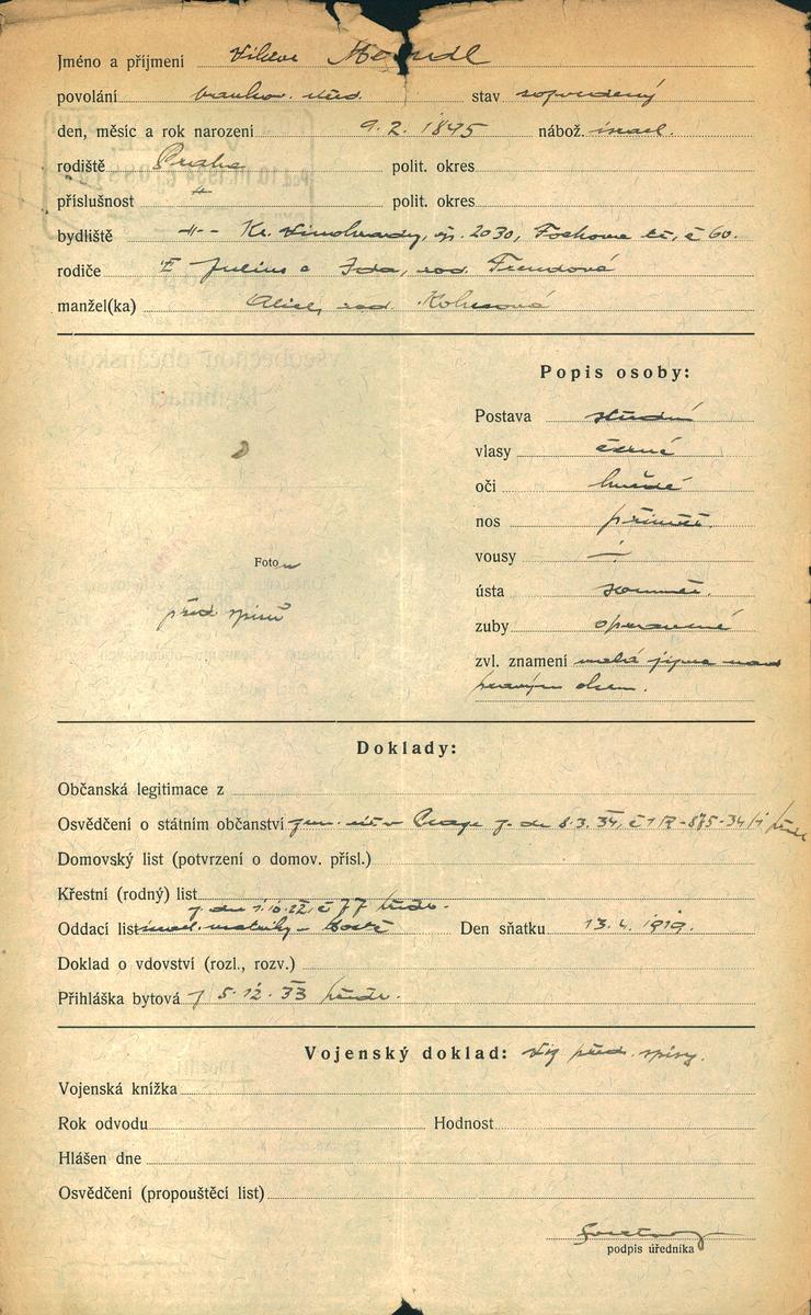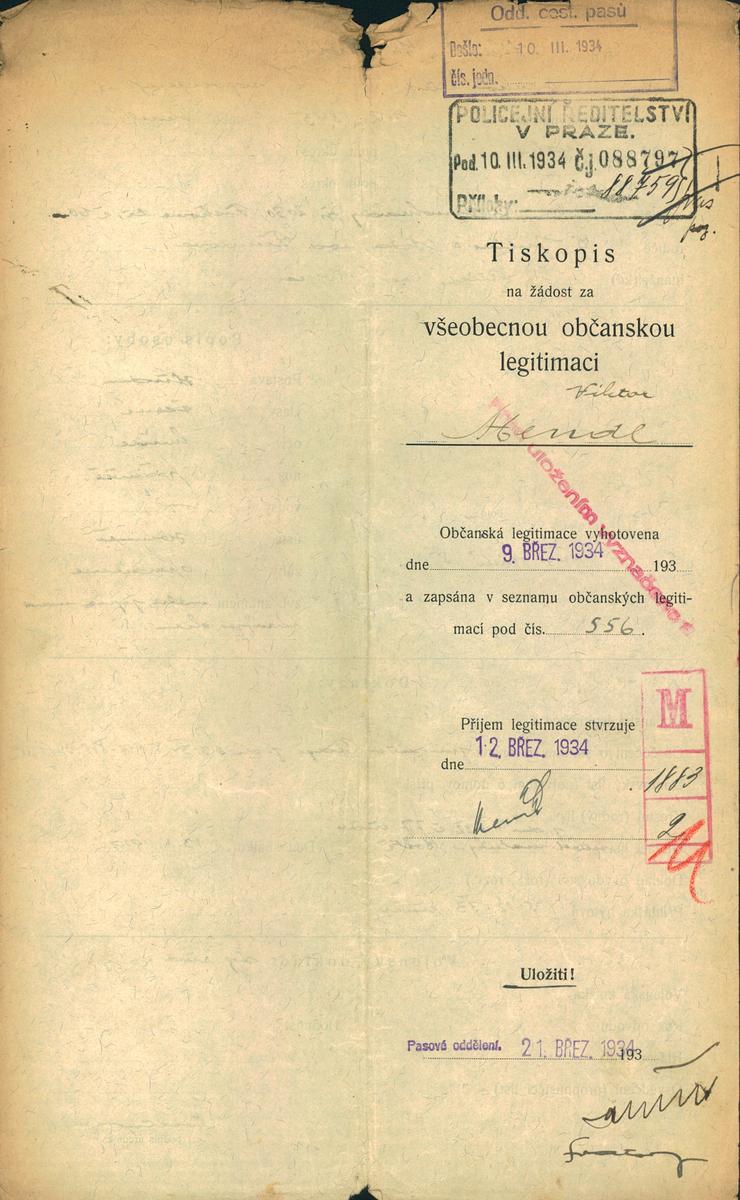 Mendl Viktor: Žádost o vydání občanské legitimace