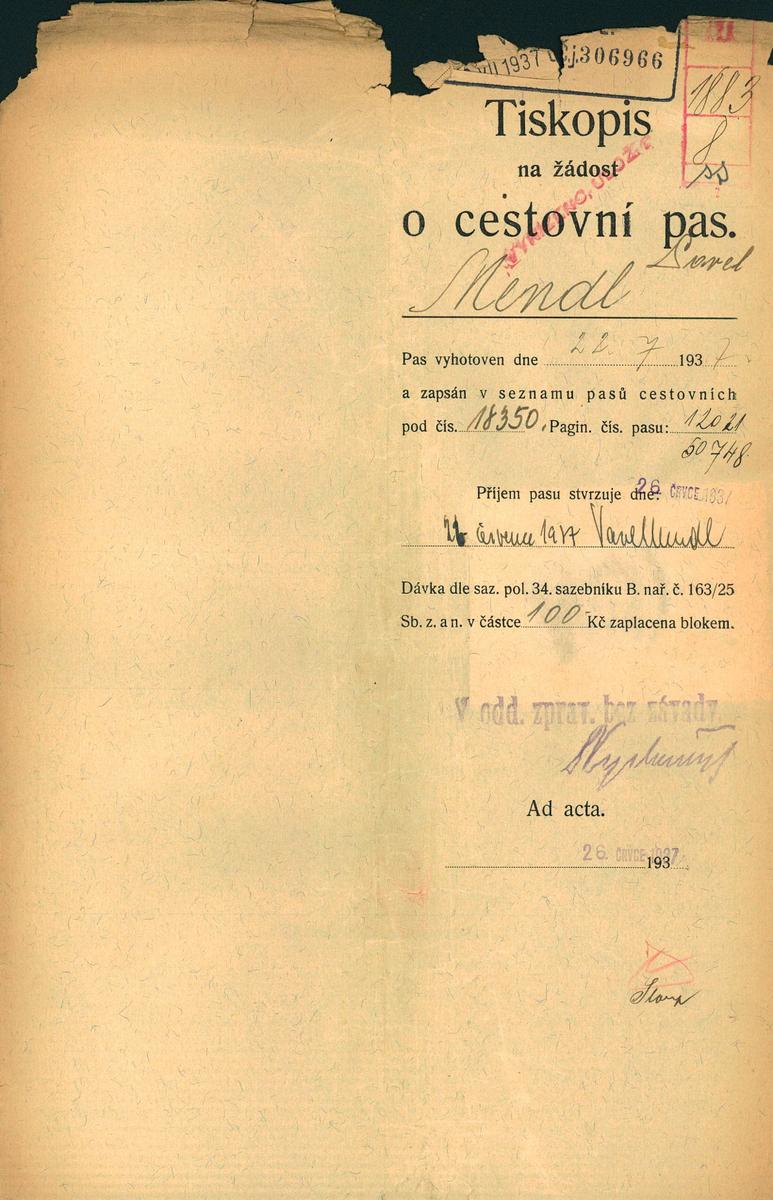 Mendl Pavel: Žádost o vydání cestovního pasu