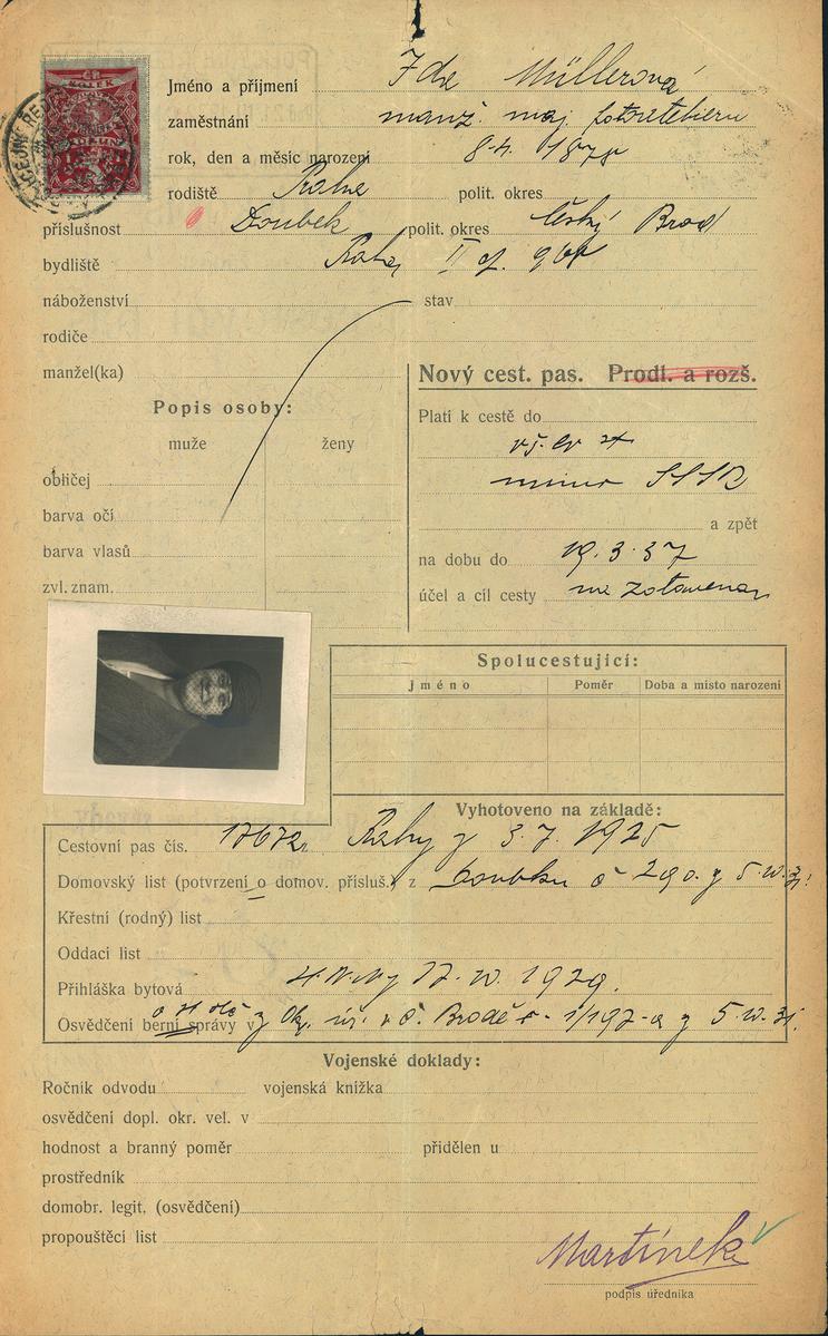 Müllerová Ida: Žádost o vydání cestovního pasu