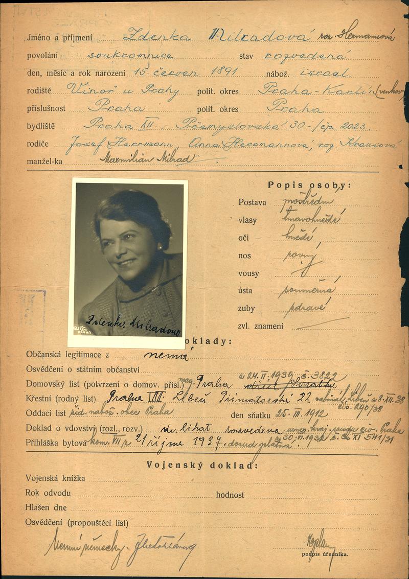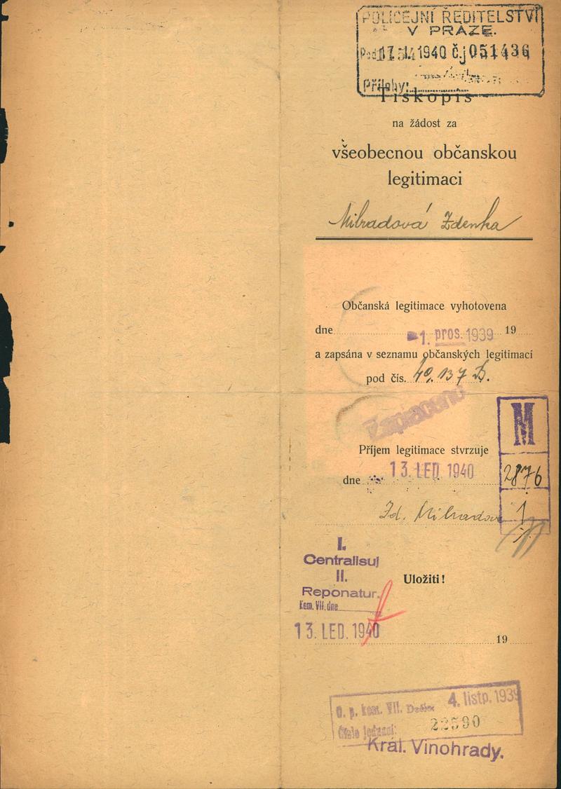 Milrádová Zdenka: Žádost o vydání občanské legitimace