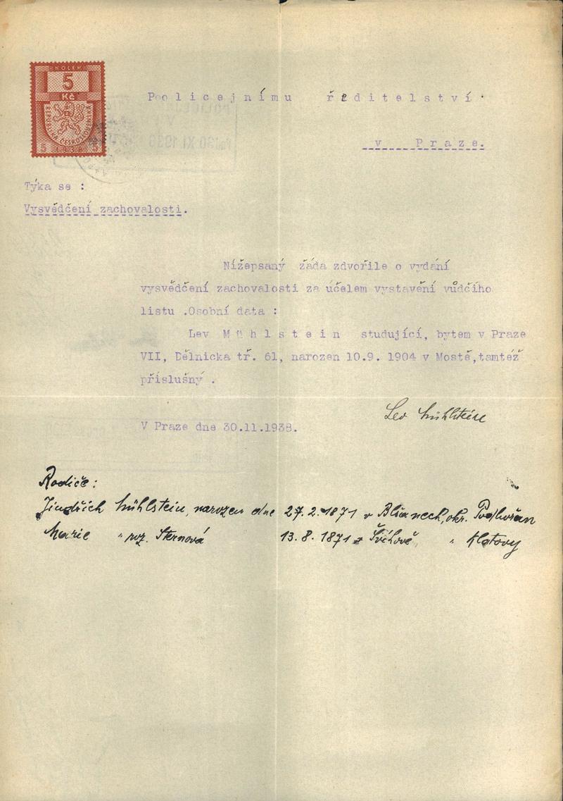Mühlstein Leo: Žádost o vystavení vysvědčení zachovalosti