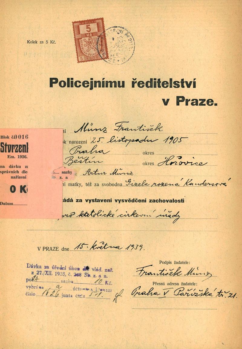 Münz František: Žádost o vystavení vysvědčení zachovalosti