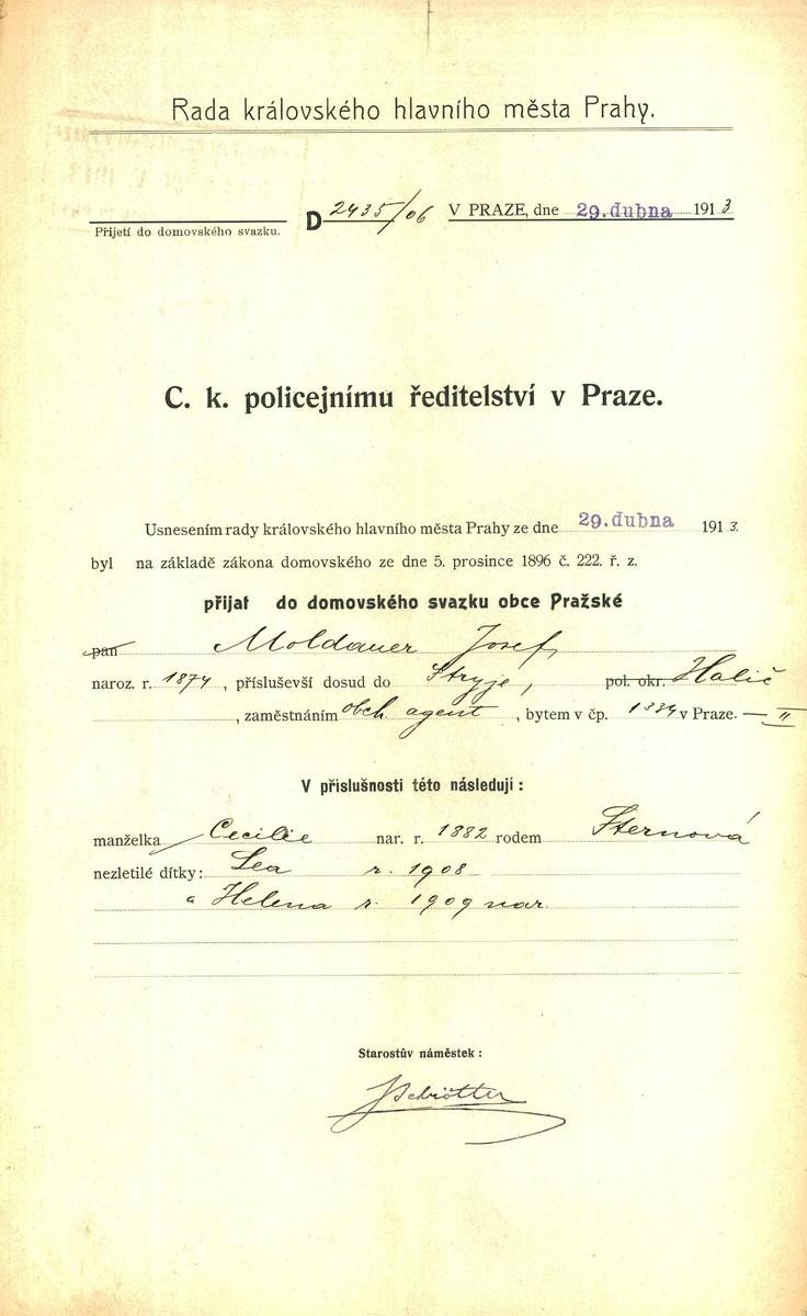 Moldauer Josef: Nabytí domovského práva
