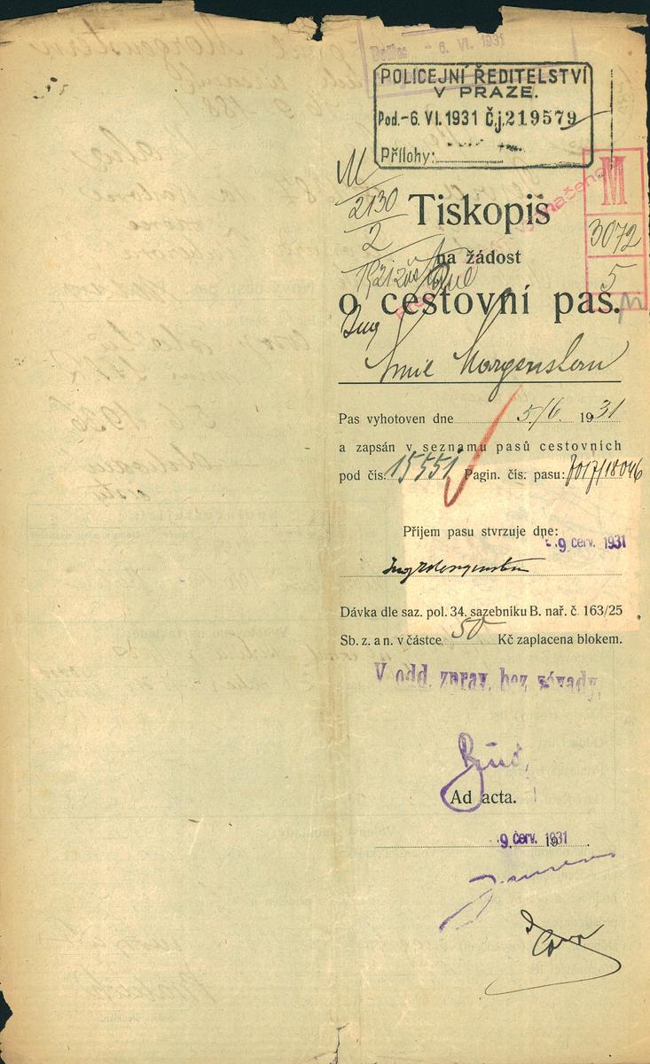 Morgenstern Emil: Žádost o vydání cestovního pasu