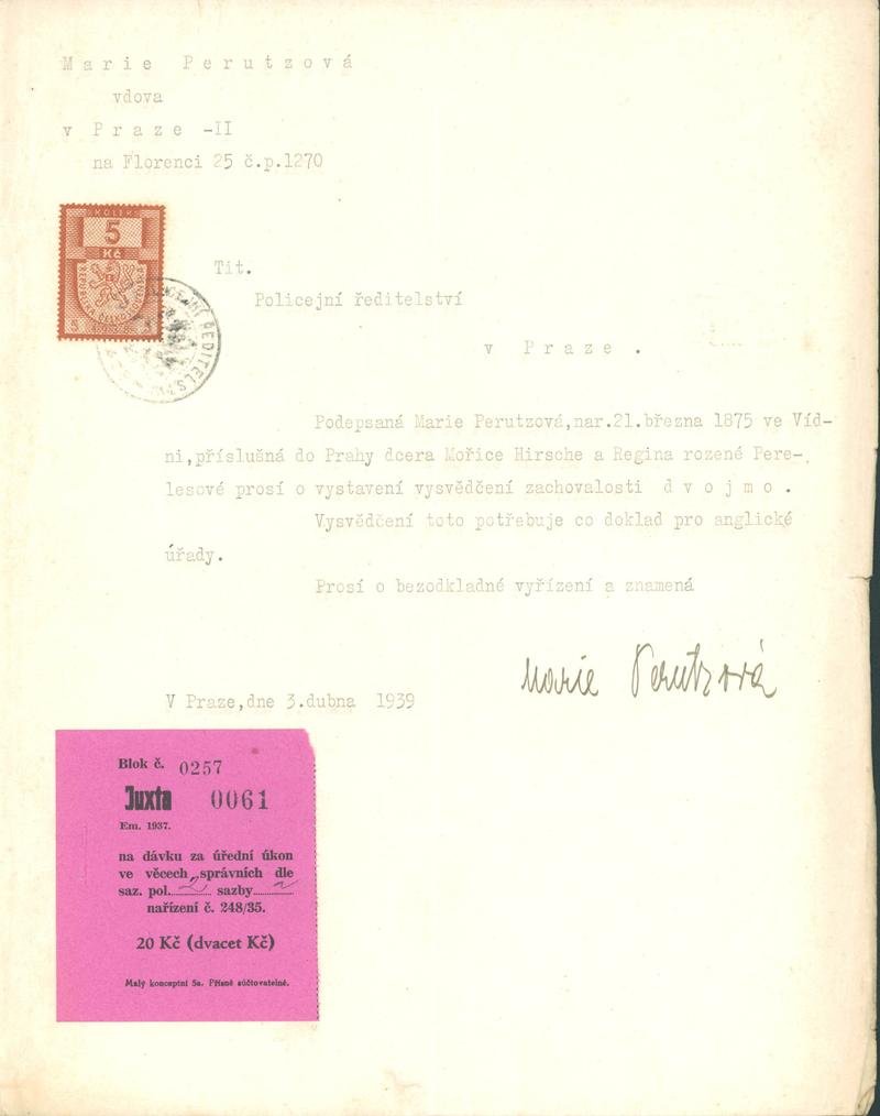 Perutzová Marie: Žádost o vystavení vysvědčení zachovalosti