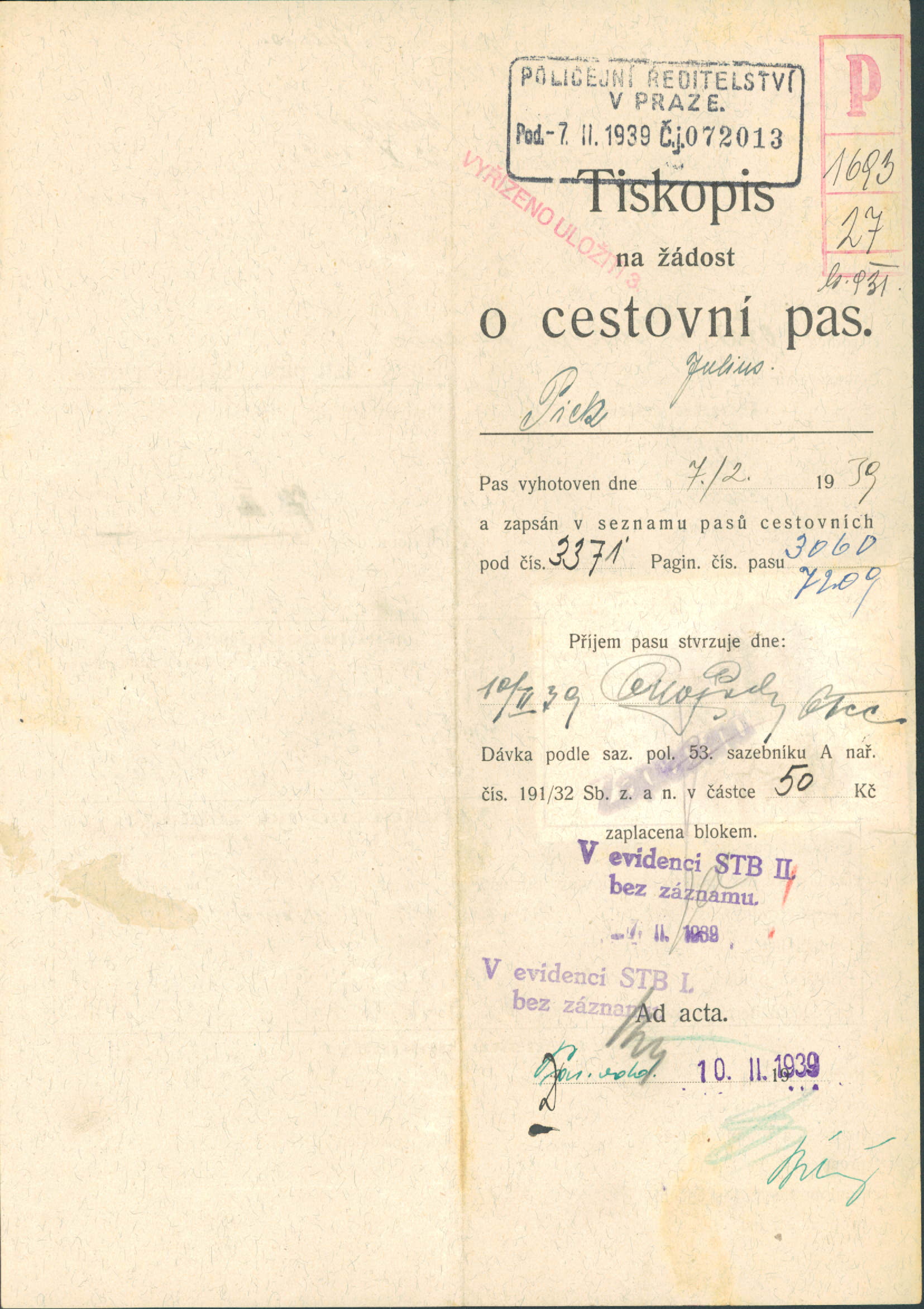 Pick Julius: Žádost o vydání cestovního pasu