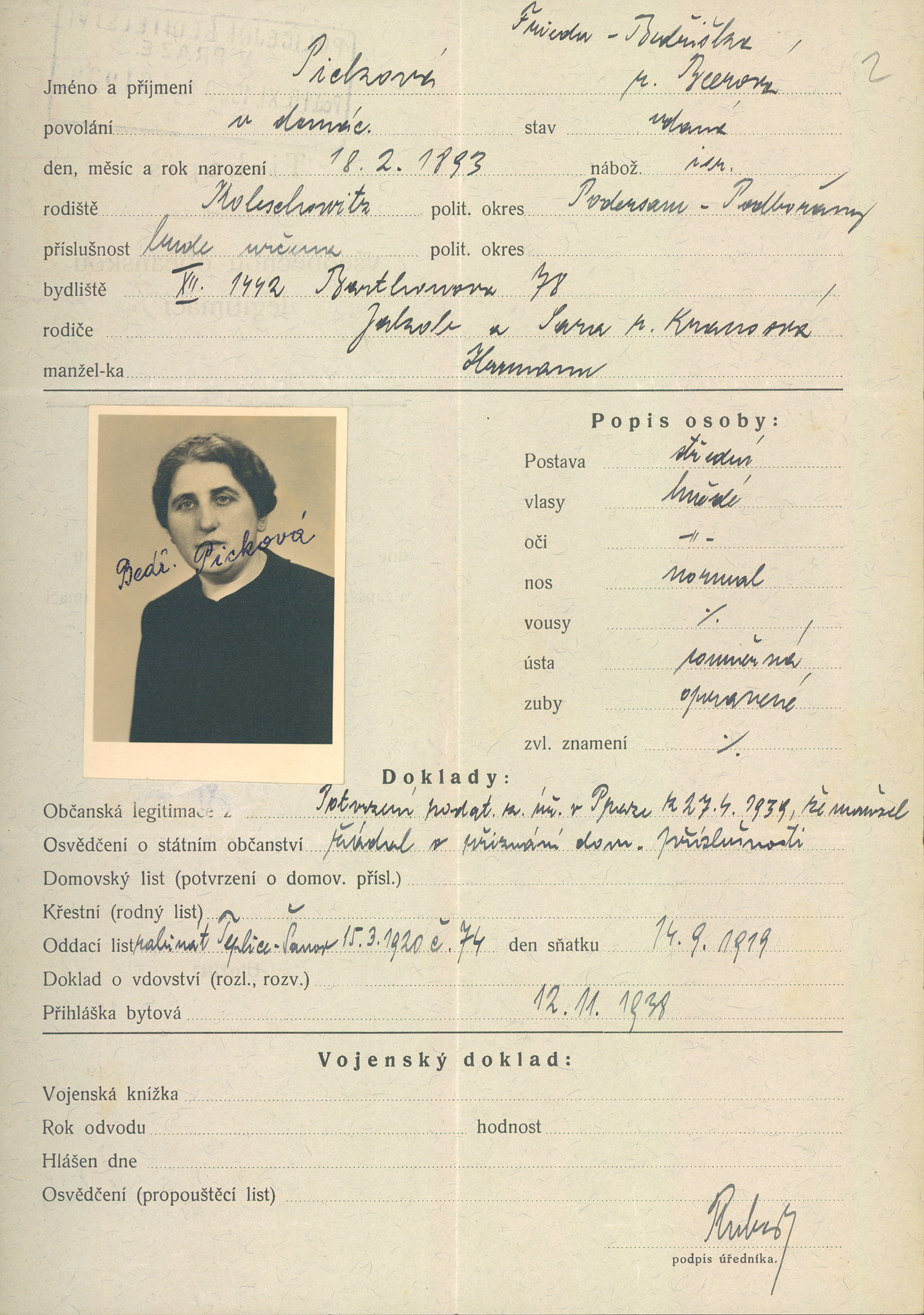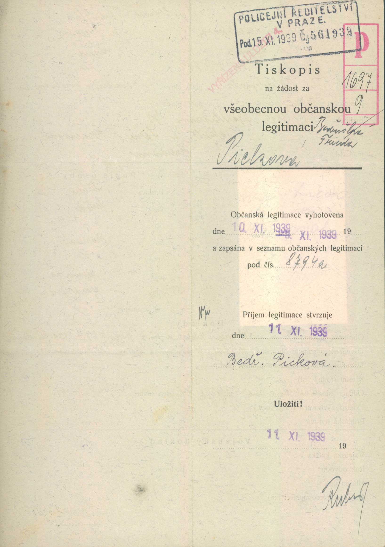 Picková Frieda: Žádost o vydání občanské legitimace