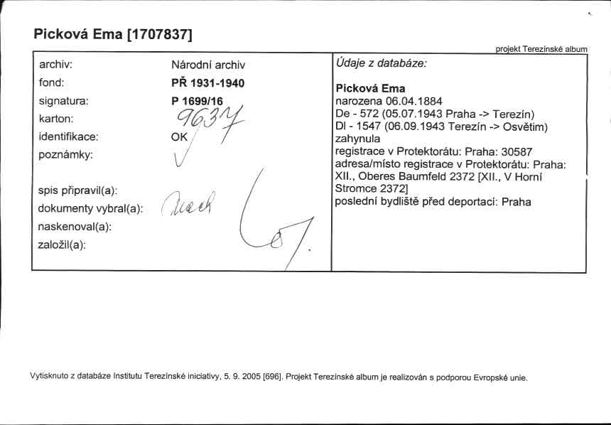 This database contains the names and fates of those who were deported from the territory of today’s Czech Republic, be it their homeland or may they have been deported to the Theresienstadt ghetto before from different european countries. Further, it contains basic information on those men, women and children, most of whom were Roma or Sinti, who died as prisoners of the so-called „Gypsy camp I“ Lety u Písku.