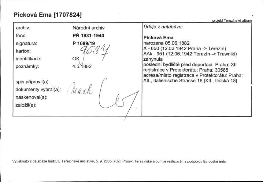 This database contains the names and fates of those who were deported from the territory of today’s Czech Republic, be it their homeland or may they have been deported to the Theresienstadt ghetto before from different european countries. Further, it contains basic information on those men, women and children, most of whom were Roma or Sinti, who died as prisoners of the so-called „Gypsy camp I“ Lety u Písku.