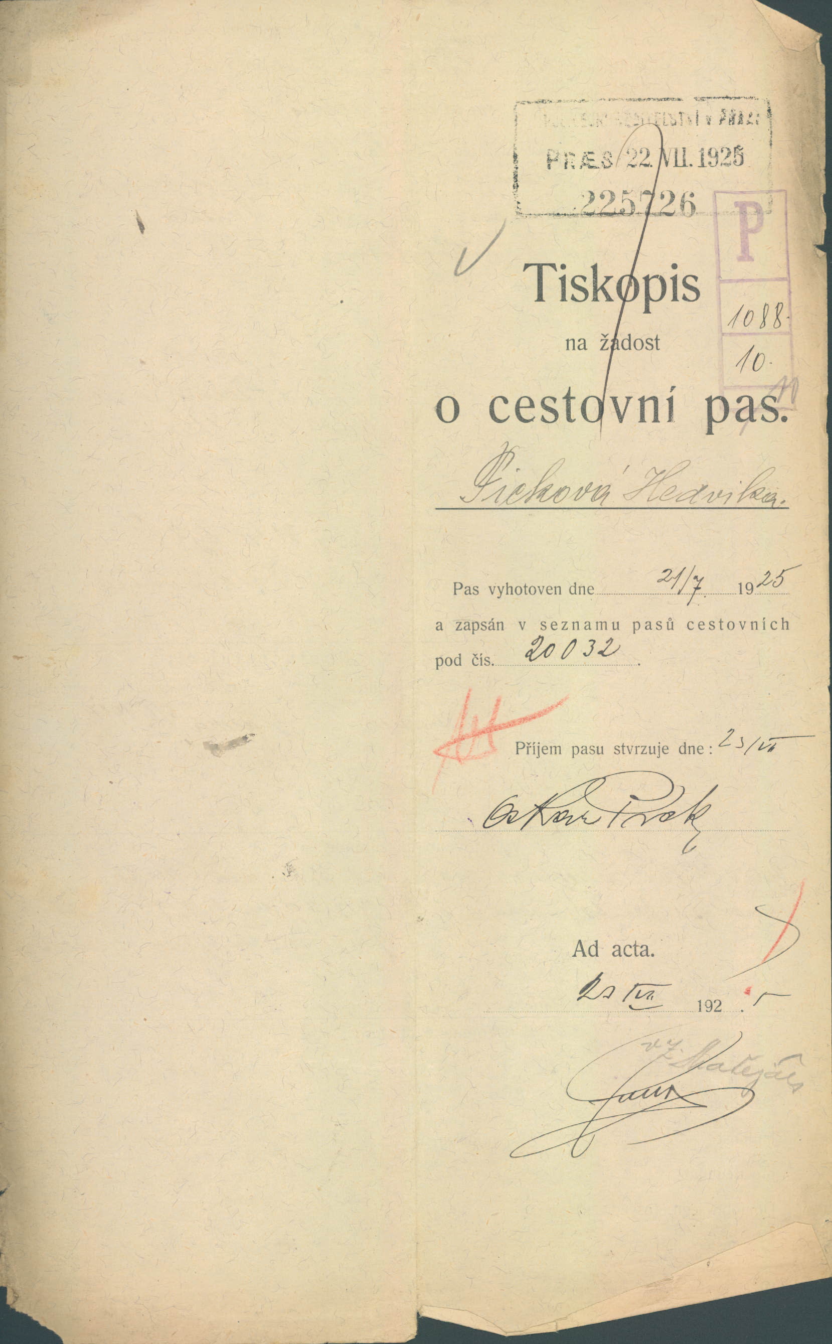 Picková Hedvika: Žádost o vydání cestovního pasu