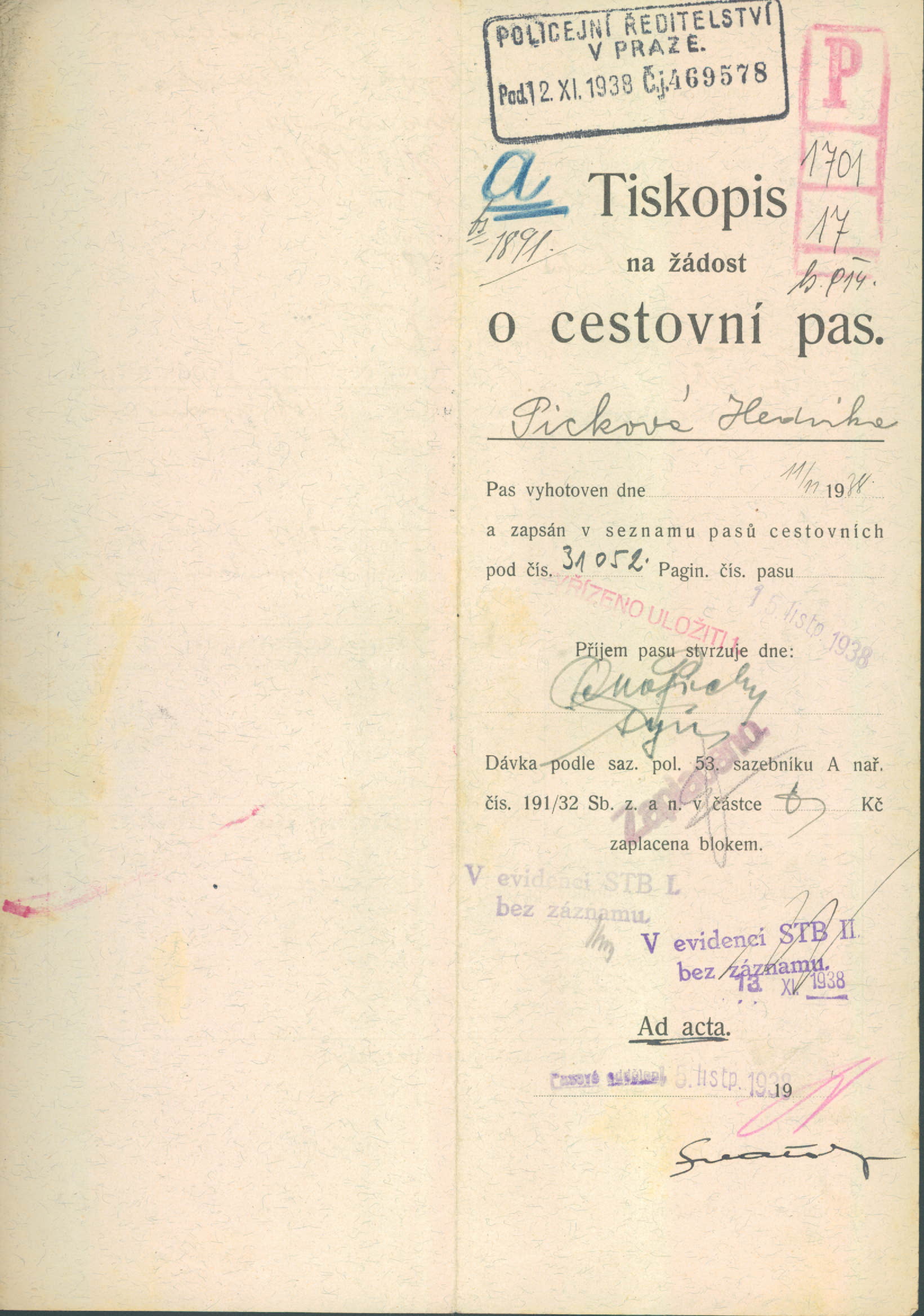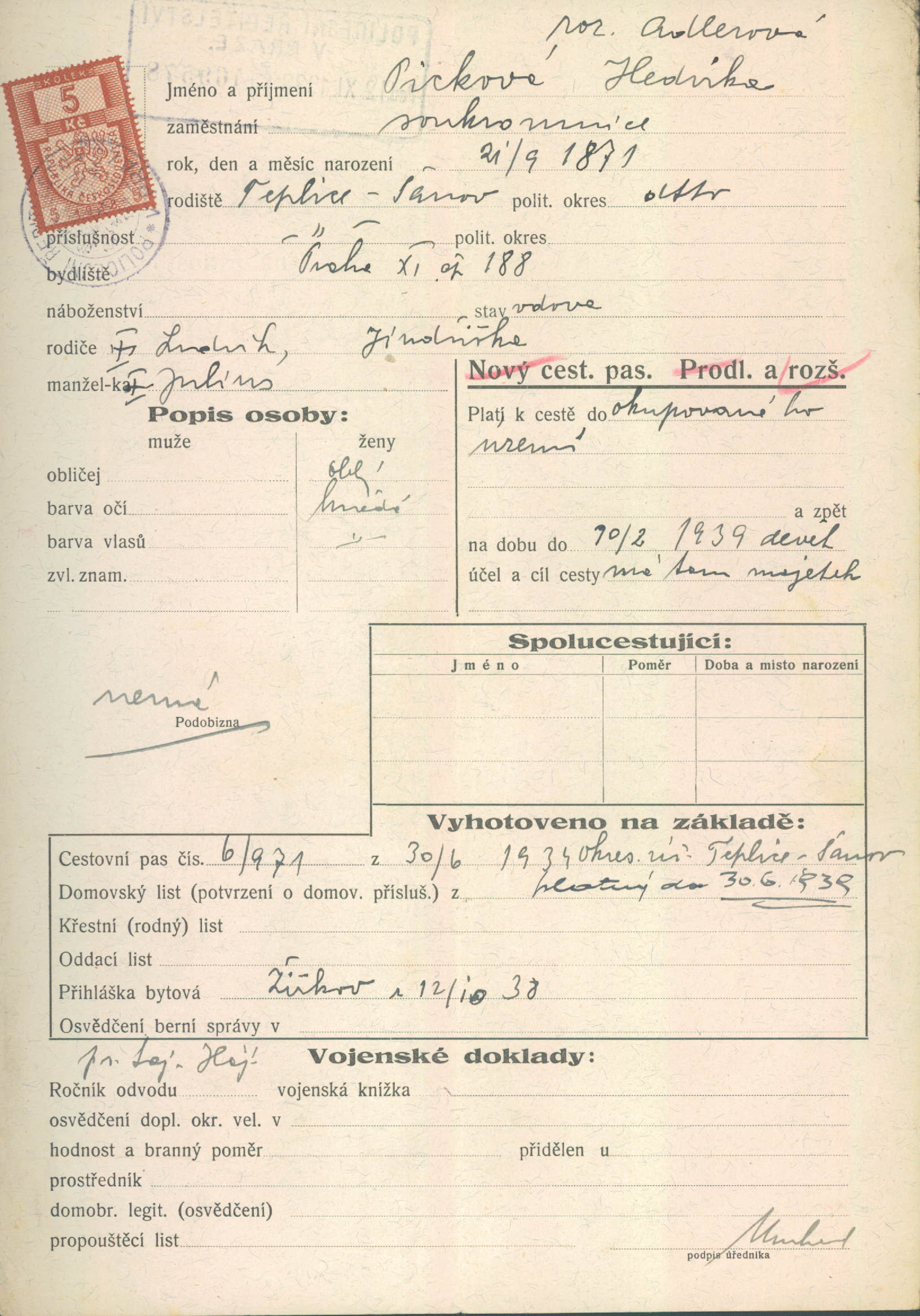 Picková Hedvika: Žádost o prodloužení cestovního pasu