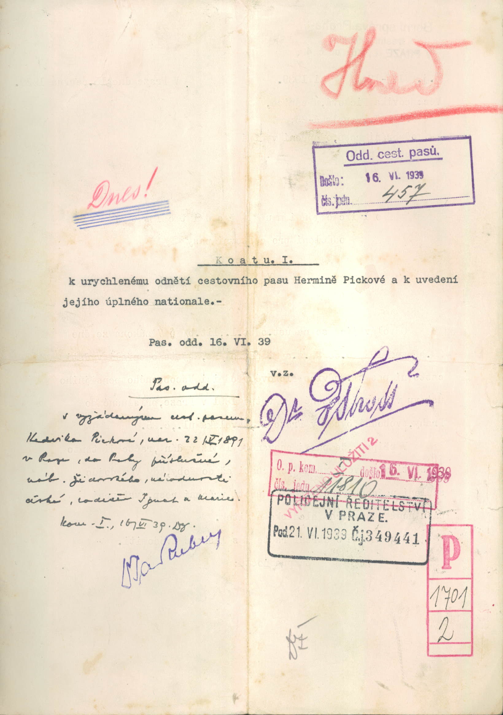 Picková Hedvika: Zamítnutí vydání cestovního pasu