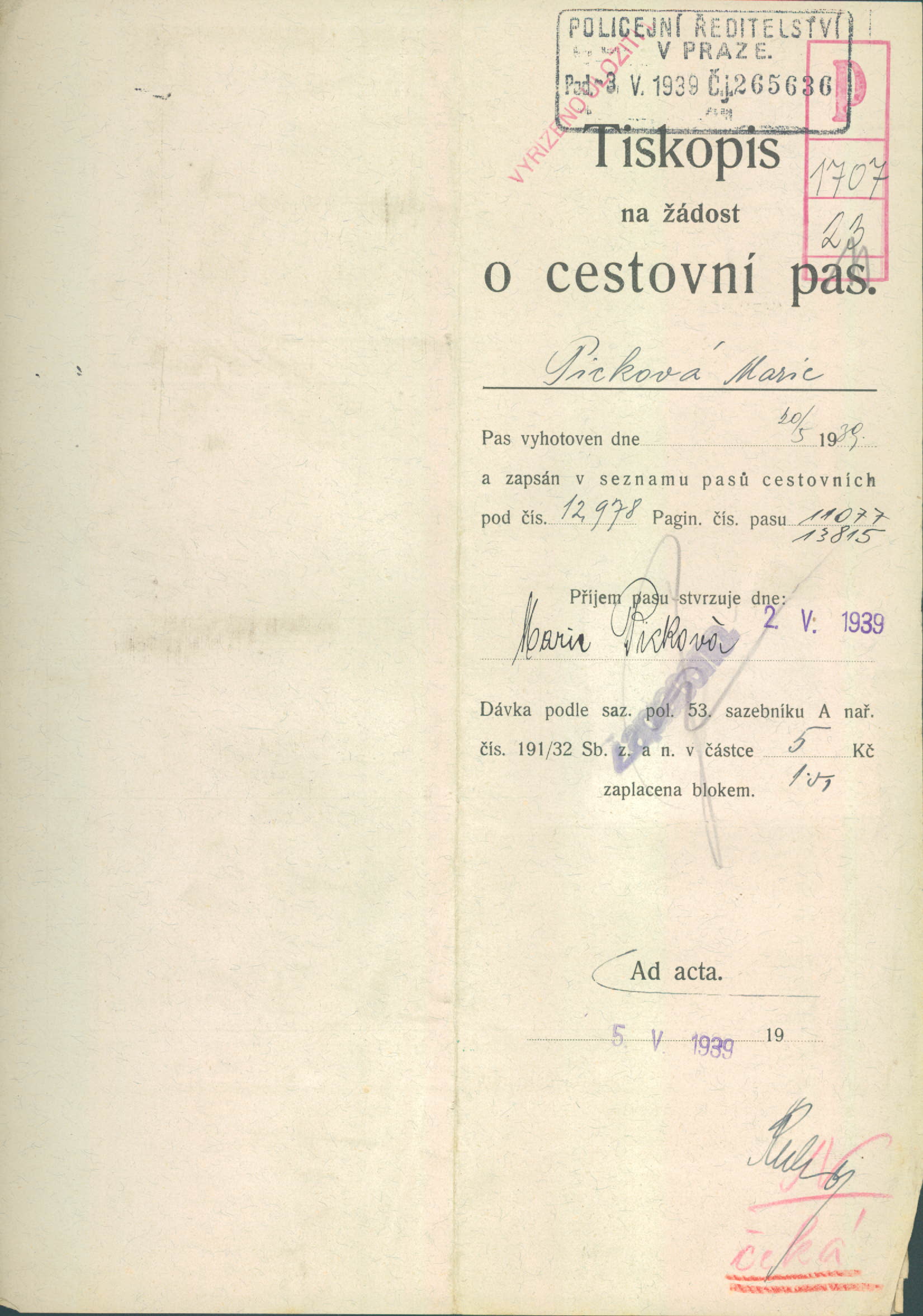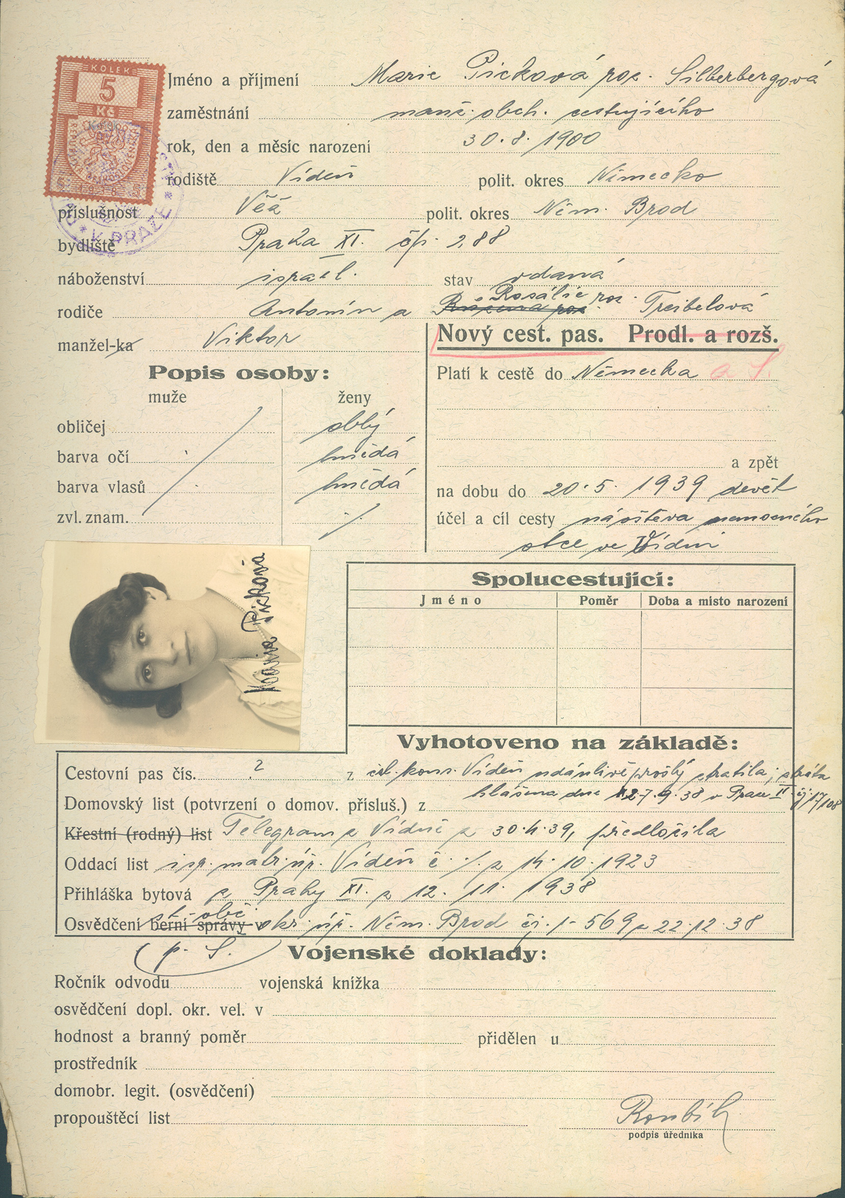 Picková Marie: Žádost o vydání cestovního pasu