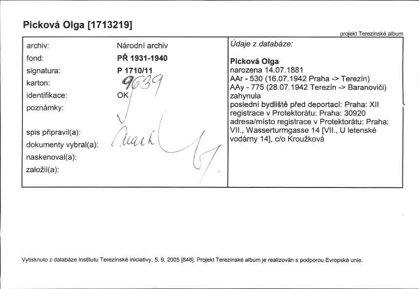 This database contains the names and fates of those who were deported from the territory of today’s Czech Republic, be it their homeland or may they have been deported to the Theresienstadt ghetto before from different european countries. Further, it contains basic information on those men, women and children, most of whom were Roma or Sinti, who died as prisoners of the so-called „Gypsy camp I“ Lety u Písku.