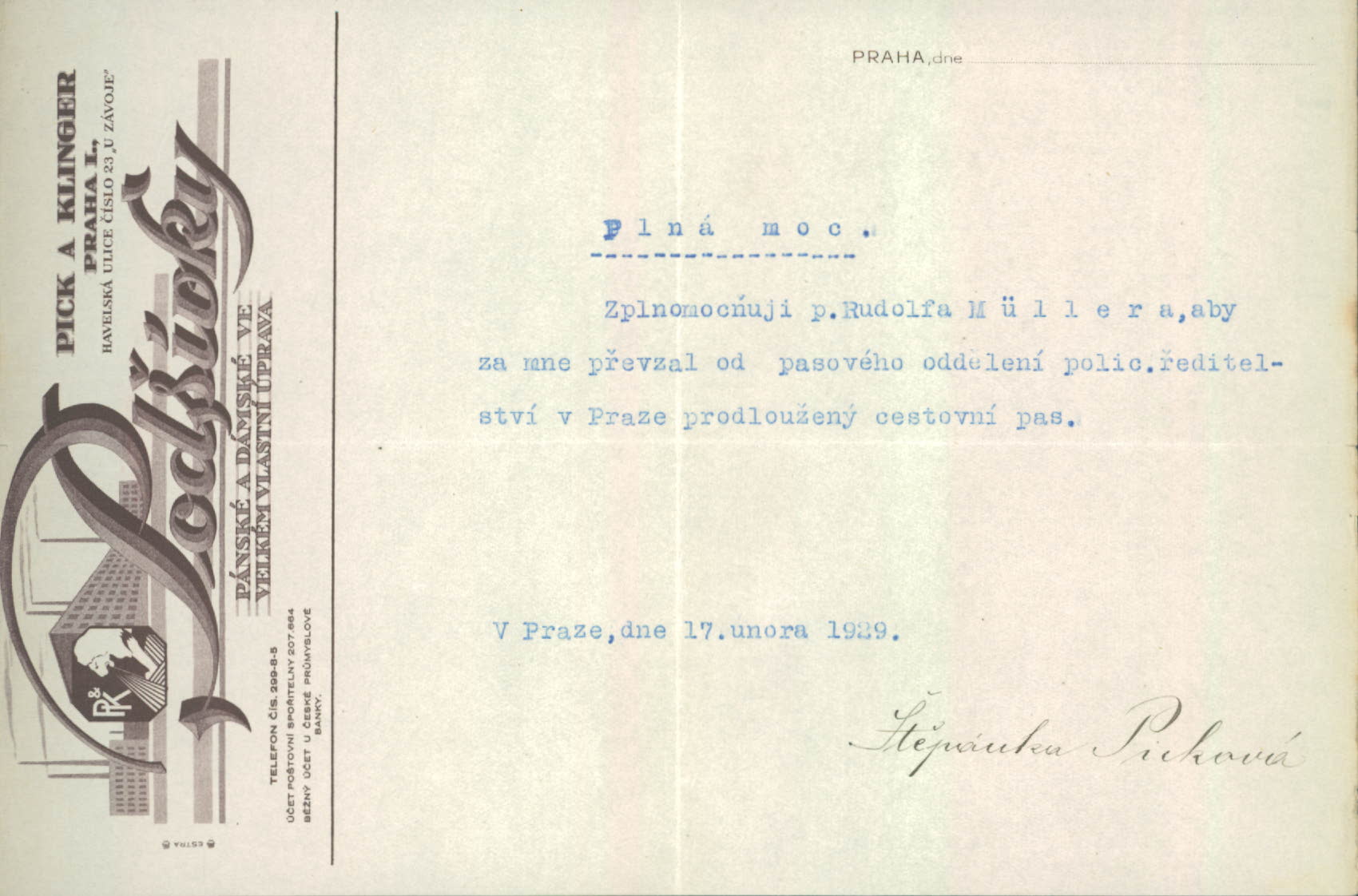 Picková Štěpánka: Plná moc k vyzvednutí cestovního pasu