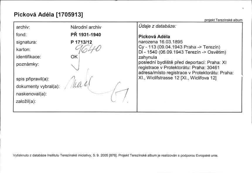 This database contains the names and fates of those who were deported from the territory of today’s Czech Republic, be it their homeland or may they have been deported to the Theresienstadt ghetto before from different european countries. Further, it contains basic information on those men, women and children, most of whom were Roma or Sinti, who died as prisoners of the so-called „Gypsy camp I“ Lety u Písku.